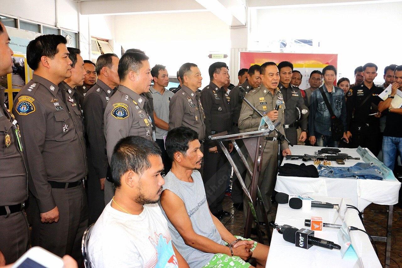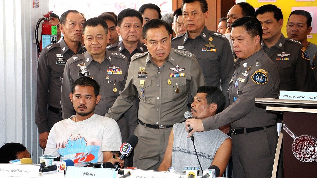 วันที่ 26 ก.พ. 58 ที่กองบัญชาการตำรวจสอบสวนกลาง (บช.ก.) พล.ต.อ.สมยศ พุ่มพันธ์ุม่วง ผู้บัญชาการตำรวจแห่งชาติ (ผบ.ตร) พร้อมด้วย พล.ต.ต.ฐิติราช หนองหาญพิทักษ์ รรท ผบช.ก. พร้อมทั้ง พ.ต.อ.อัครเดช พิมลศรี รักษาราชการผู้บังคับการกองบังคับการปราบปราม (รรท.ผบก.ป.) พ.ต.อ.ภูมินทร์ พุ่มพันธ์ุม่วง ผกก.5 บก.ป. และตำรวจภูธรภาค 8 ร่วมกันแถลงผลการจับกุม นายกลวัชร สุขรักษา หรือ นก อายุ 42 ปี และนายไกรวิชร สกุณา หรือ โต๊ด อายุ 23 ปี