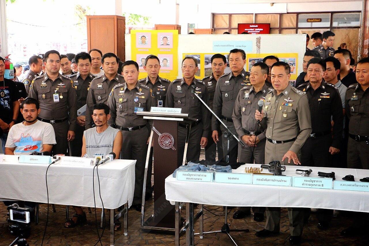 "ผบ.ตร." กางโต๊ะแถลงจับกุม 3 ใน 4 คนร้าย พร้อมของกลางอาวุธที่ใช้ก่อเหตุ หลังขับกระบะบุกกระหน่ำยิง 4 ศพดับคา ร.ร.บ้านดอนโตนด ตร.เร่งตามจับอีกหนึ่งที่ยังหลบหนี เบื้องต้นรับสารภาพขัดผลประโยชน์ประมูลงาน อ.ปากพนัง