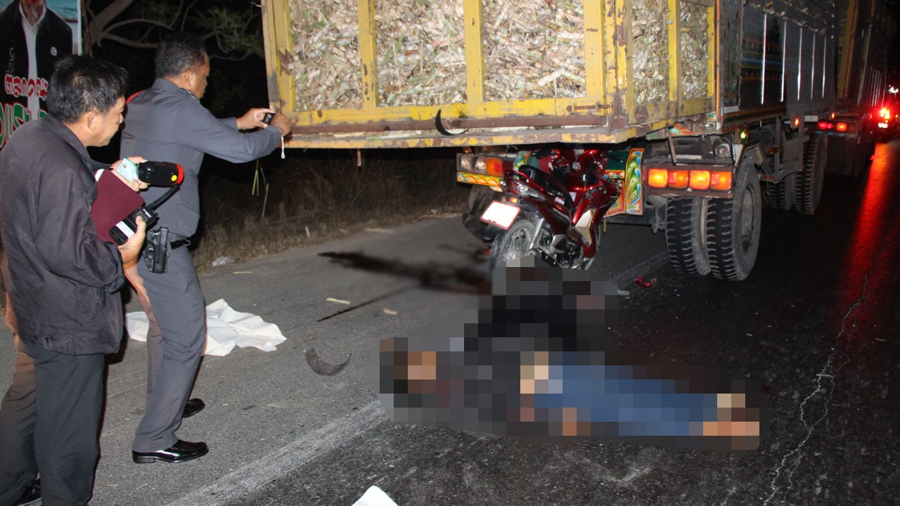 รถพ่วงบรรทุกอ้อยส่งโรงงานยางระเบิด ต้องจอดข้างทาง หนุ่มสาวขี่ จยย.มาในความมืด พุ่งเสียบติดคาท้ายรถ จยย.ตั้งอยู่ไม่ล้ม แต่คนกระเด็น กะโหลกแตก ตายอยู่บนถนน 2 ศพ คาดมืด ทางเปลี่ยว ไม่ทันสังเกต...