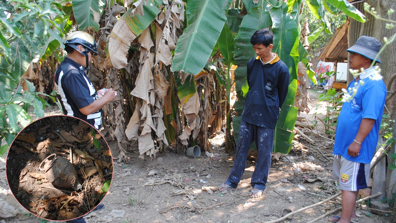 หนุ่มใหญ่สวรรคโลก พบระเบิดพร้อมใช้งาน อยู่กลางสวนกล้วย ขณะกำลังหาหัวปลีเพื่อนำมาจิ้มกับพริก เห็นไก่กำลังคุ้ยเขี่ยลูกอะไรกลมๆ อยู่ที่ดิน จึงเก็บไปให้เพื่อนบ้านดูด้วยความสงสัย ตร.ตรวจสอบพบเป็นระเบิดพร้อมใช้งาน