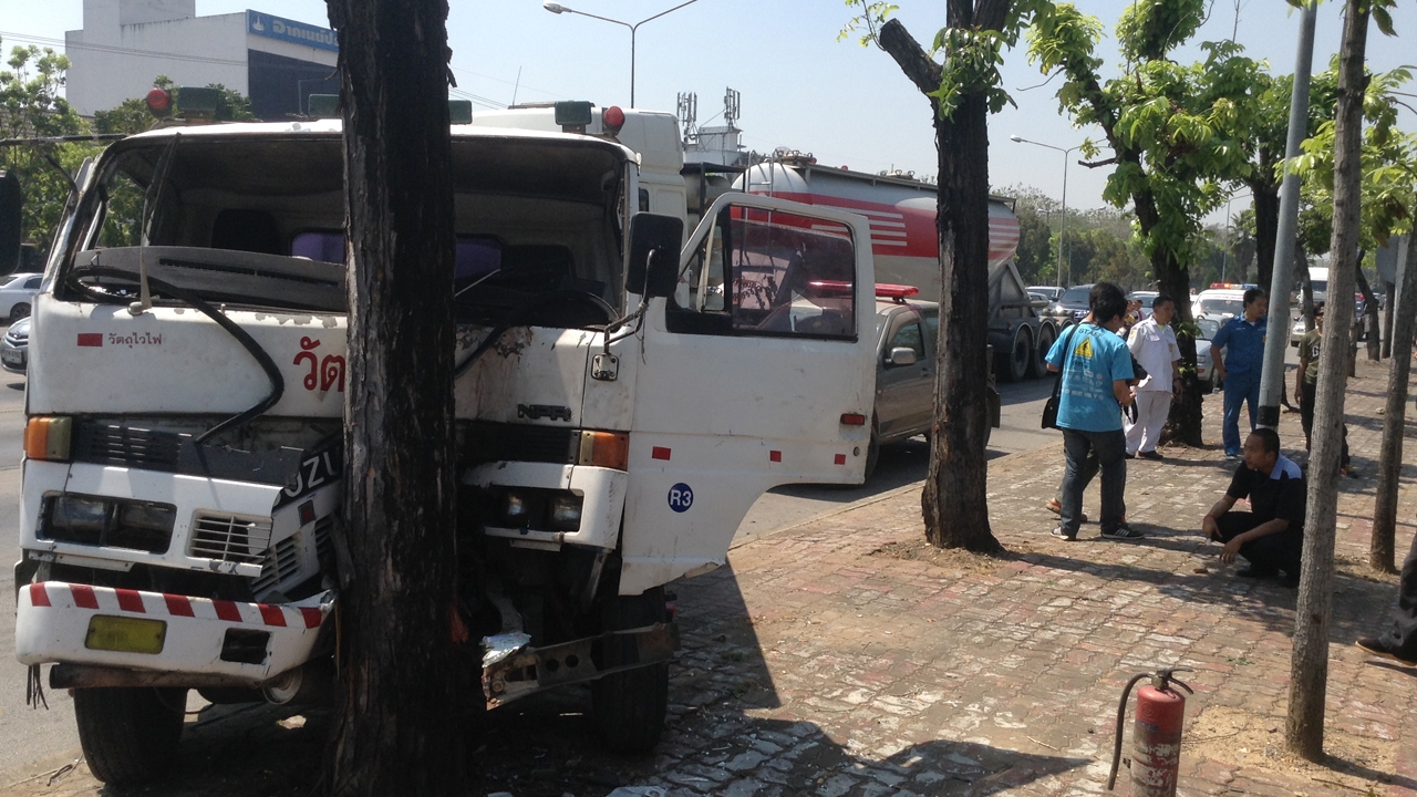 คนขับรถบรรทุกน้ำมันรีบนำน้ำมัน 2 พันลิตรไปส่งให้ลูกค้า เกิดเบรกไม่อยู่ โชเฟอร์ตัดสินใจหักพวงมาลัยหลบ พุ่งชนต้นไม้เกาะกลางถนนสี่แยกไฟแดงกลางเมืองลำปาง คนขับหวิดดับ สภาพรถพังยับทั้งคัน...