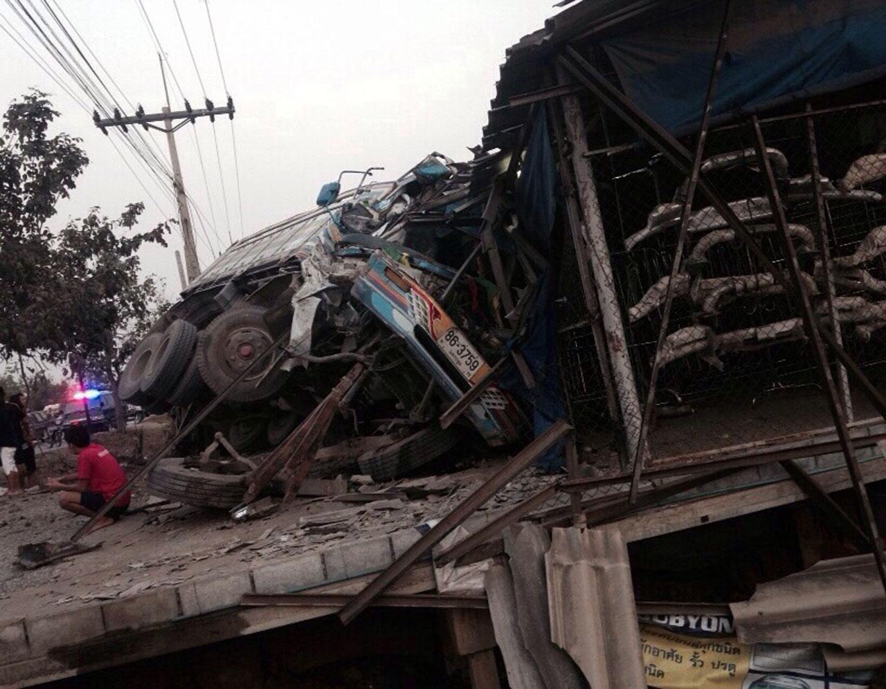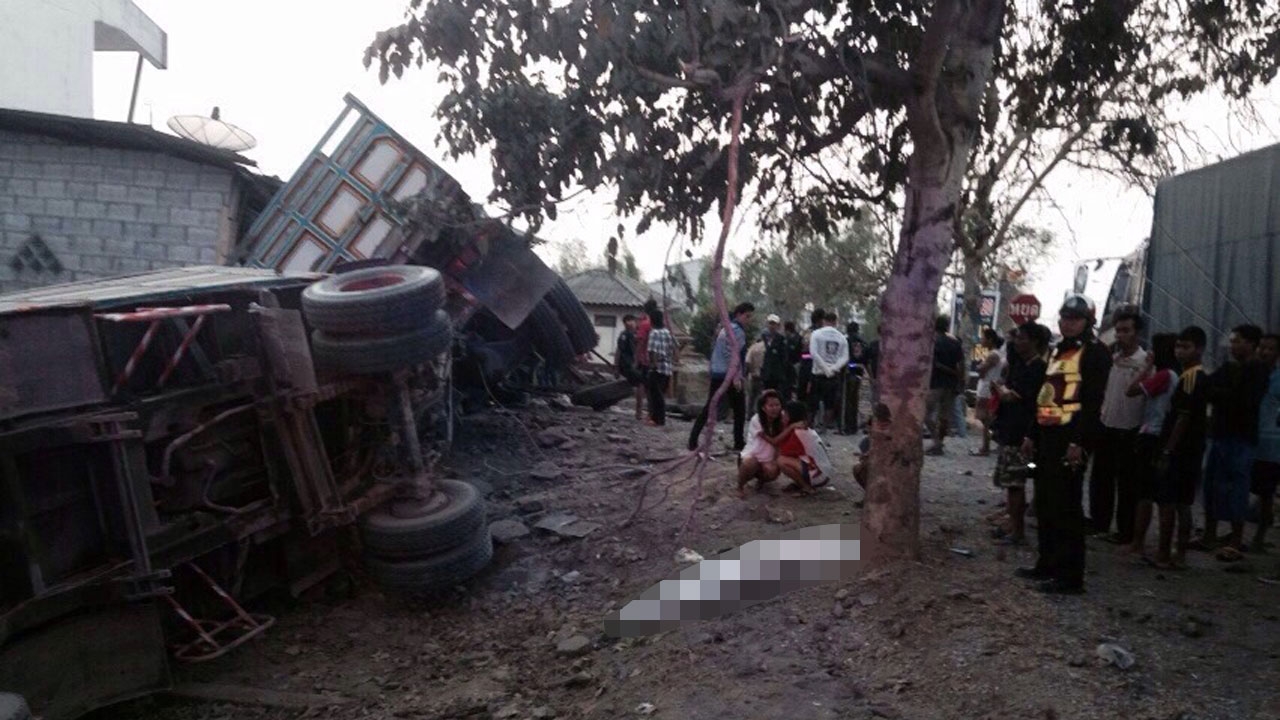 รถพ่วงบรรทุกหินเต็มคัน คนขับหลับใน พุ่งชนรถที่กำลังจอดรอขบวนรถไฟ แล้วเสียหลักพลิกคว่ำทับร้านสแตนเลส ทำให้หนุ่มนครปฐม วัย 22 ปี เสียชีวิตสยอง ส่วนคนขับวัย 40 ปี บาดเจ็บสาหัส...