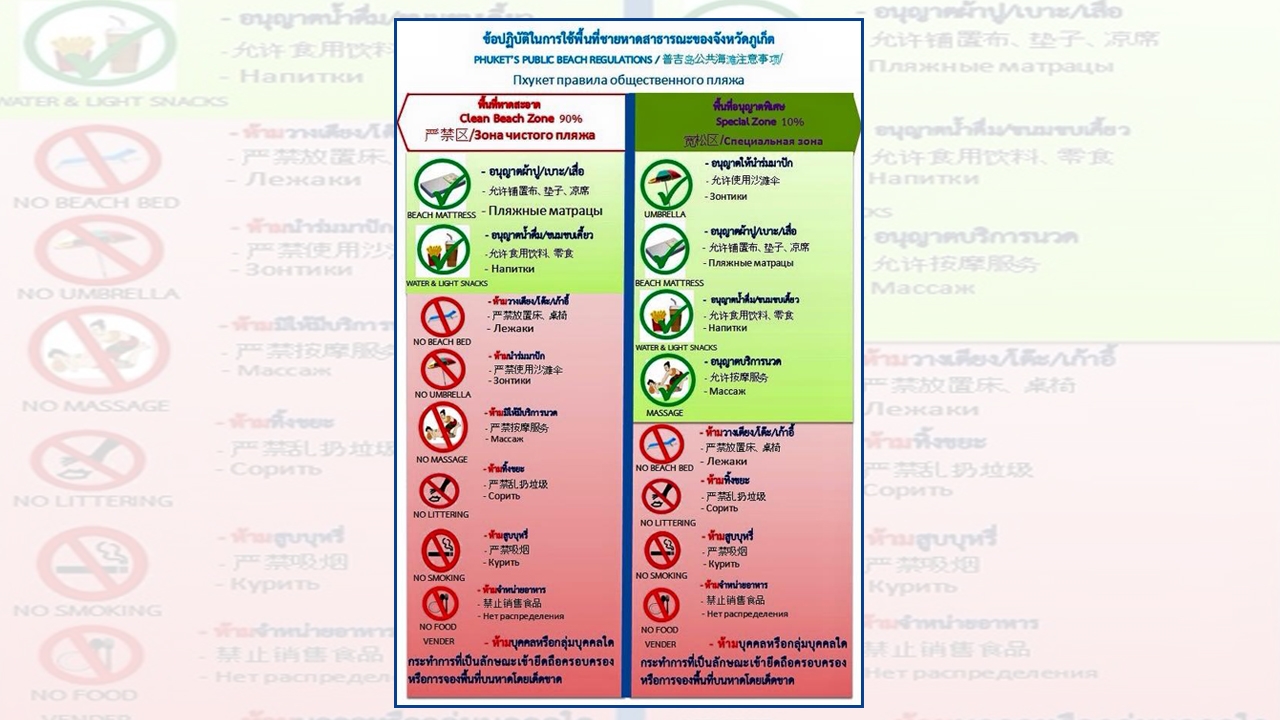 ภูเก็ตจัดทำป้ายข้อห้าม-สิ่งที่ทำได้บอกนักท่องเที่ยวแล้ว 4 ภาษา ปักชายหาดรอบเกาะ หลังเกิดปัญหานักท่องเที่ยวต่างชาติไม่เข้าใจ ย้ำพื้นที่หาดสะอาด 90% ห้ามวางเตียง-ร่ม