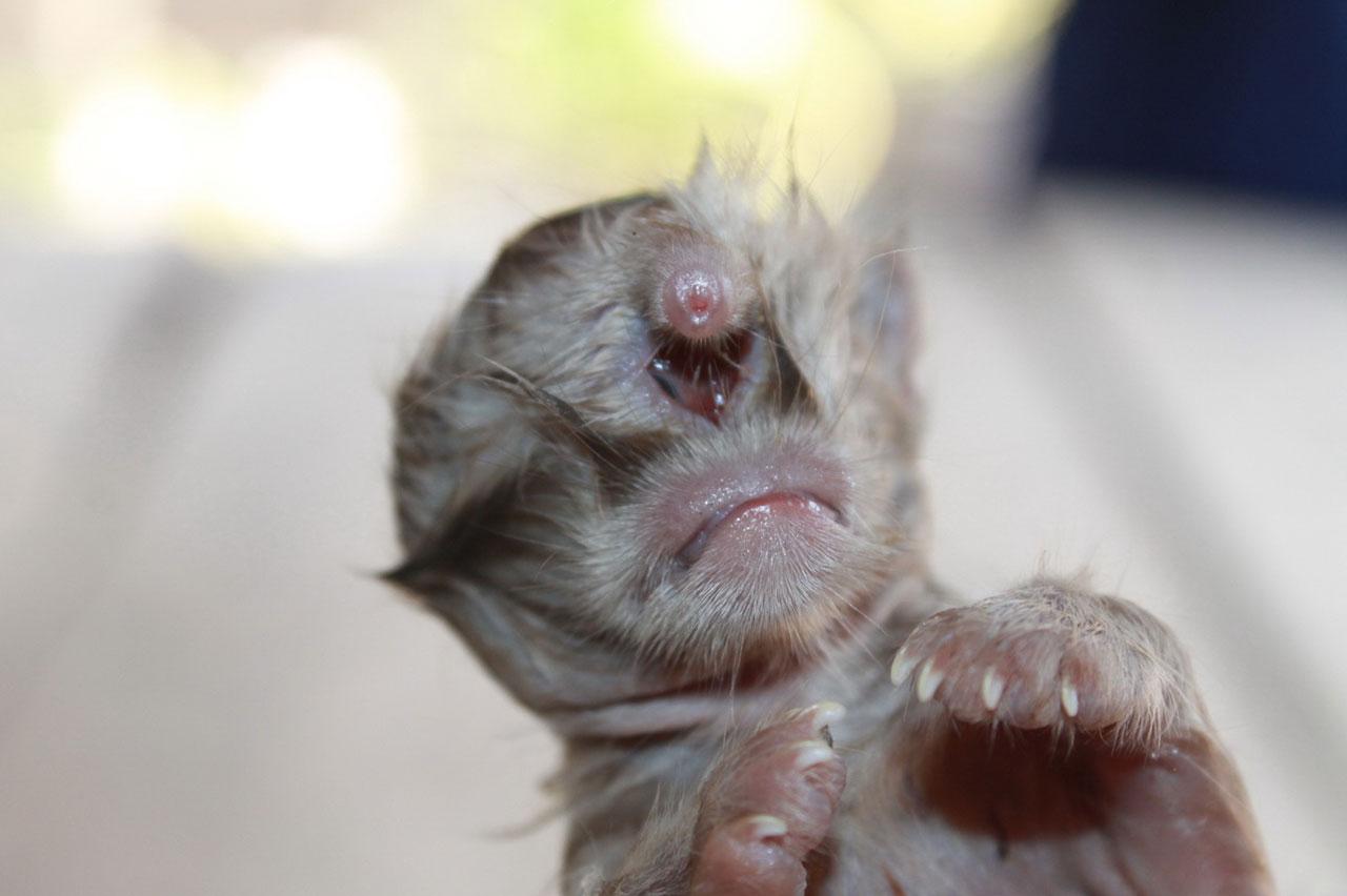 โดยลูกแมวที่ออกมาตัวสุดท้ายซึ่งมีความผิดปกติหลังจากออกมาได้เพียงครึ่งชั่วโมงก็ตาย มีลักษณะแตกต่างจากลูกแมวตัวอื่นๆ ที่บนใบหน้าบริเวณหน้าผากมีก้อนเนื้อคล้ายๆ งวงช้างยื่นออกมาประมาณ 3 เซนติเมตร และบริเวณใต้ก้อนเนื้อมีดวงตา 1 ดวงตรงกลางหน้าผากพอดี ส่วนอวัยวะอื่นๆ ครบสมบูรณ์
