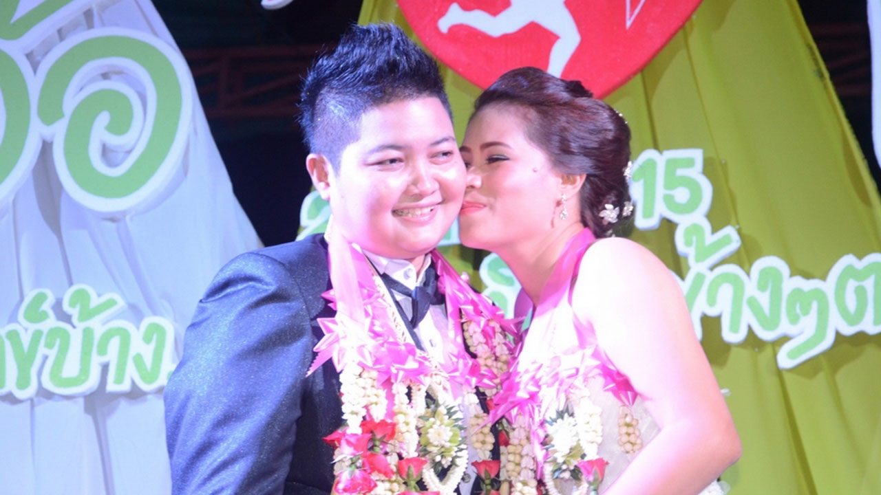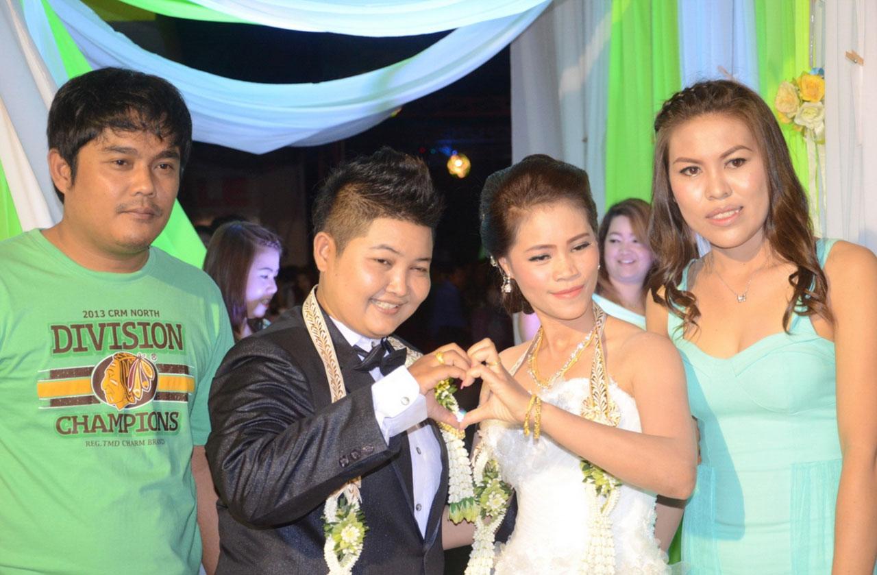 วันที่ 1 มี.ค. 2558 ผู้สื่อข่าวรายงานว่า เมื่อเวลา 18.00 น. วันที่ 28 ก.พ.58 มีการจัดงานเลี้ยงฉลองมงคลสมรสระหว่างคู่บ่าวสาวที่เป็นผู้หญิงด้วยกันทั้งคู่ โดยเจ้าบ่าวคือ นางสาวเพ็ญนภา หรือ เพ็นซิล แสงทอง อายุ 32 ปี ส่วนเจ้าสาวคือ นางสาวกรรณิกา หรือ อ้อ มีจ่าย อายุ 36 ปี โดยทั้งคู่เป็นพนักงานขายโทรศัพท์มือถือ ซึ่งทำการจัดงานเลี้ยงฉลองสมรสที่บริเวณลานจอดรถติดกับ สี่แยกไฟแดงวัดญวน ถ.แสงชูโต ต.บ้านเหนือ จ.กาญจนบุรี โดยมีแขกที่มาร่วมงานส่วนใหญ่เป็นญาติ และบรรดากลุ่มเพื่อนของเจ้าบ่าวและเจ้าสาว ซึ่งมีการจัดเวทีมีวงดนตรีขับกล่อมและจัดเลี้ยงโต๊ะจีน 50 โต๊ะ บรรยากาศภายในงานเป็นไปอย่างคึกคัก