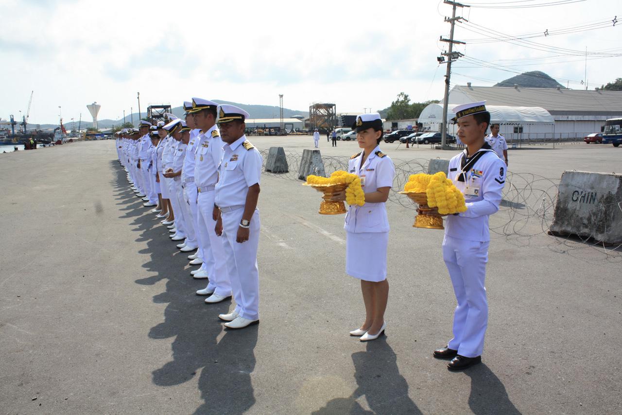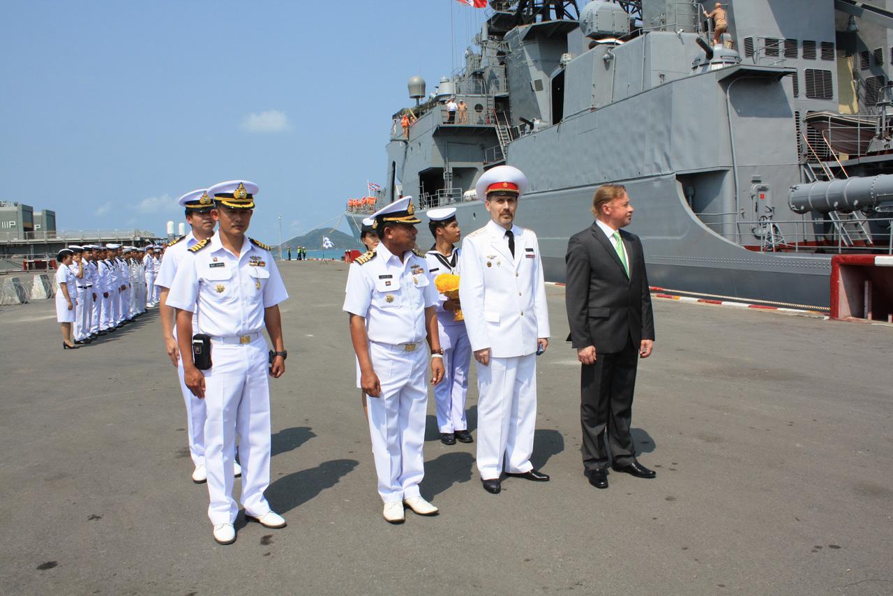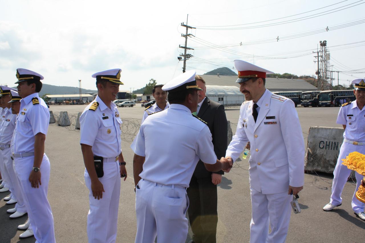ทั้งนี้ หมู่เรือของกองทัพเรือรัสเซีย มีนาวาเอก ALEXANDER V.POTAPOV รอง ผบ.กองเรือผิวน้ำ กองเรือภาคพื้นแปซิฟิค เป็นผู้บังคับการหมู่เรือ ได้เดินทางเข้าเยี่ยมคำนับ พล.ร.ท.วิพากษ์ น้อยจินดา ผู้บัญชาการฐานทัพเรือสัตหีบ เพื่อเชื่อมความสัมพันธไมตรีระหว่างกองทัพเรือของทั้ง 2 ประเทศและรับการส่งกำลังบำรุง โดยวงโยธวาทิต ฐานทัพเรือสัตหีบ ได้บรรเลงบทเพลงพร้อมตั้งแถวทหารกองเกียรติยศให้การต้อนรับอย่างสมเกียรติ