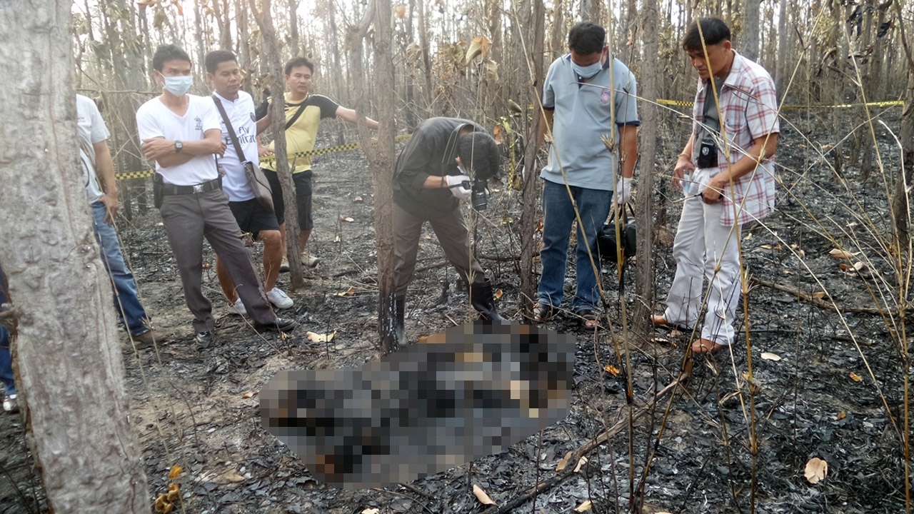 จุดที่เกิดเหตุต้องเดินเข้าไปในป่ากว่า 500 เมตร เมื่อตรวจสอบพบโครงกระดูกคาดว่าเป็นชายสูงประมาณ 175-180 ซม. อยู่ในสภาพคว่ำหน้าขาทั้งสองข้างเหมือนขัดสมาธิ บริเวณท้ายทอยเป็นรูกลวง คาดว่าเกิดจากการถูกกระแทกจนแตก ส่วนป่าบริเวณดังกล่าวถูกไฟไหม้มา 2 วันแล้ว