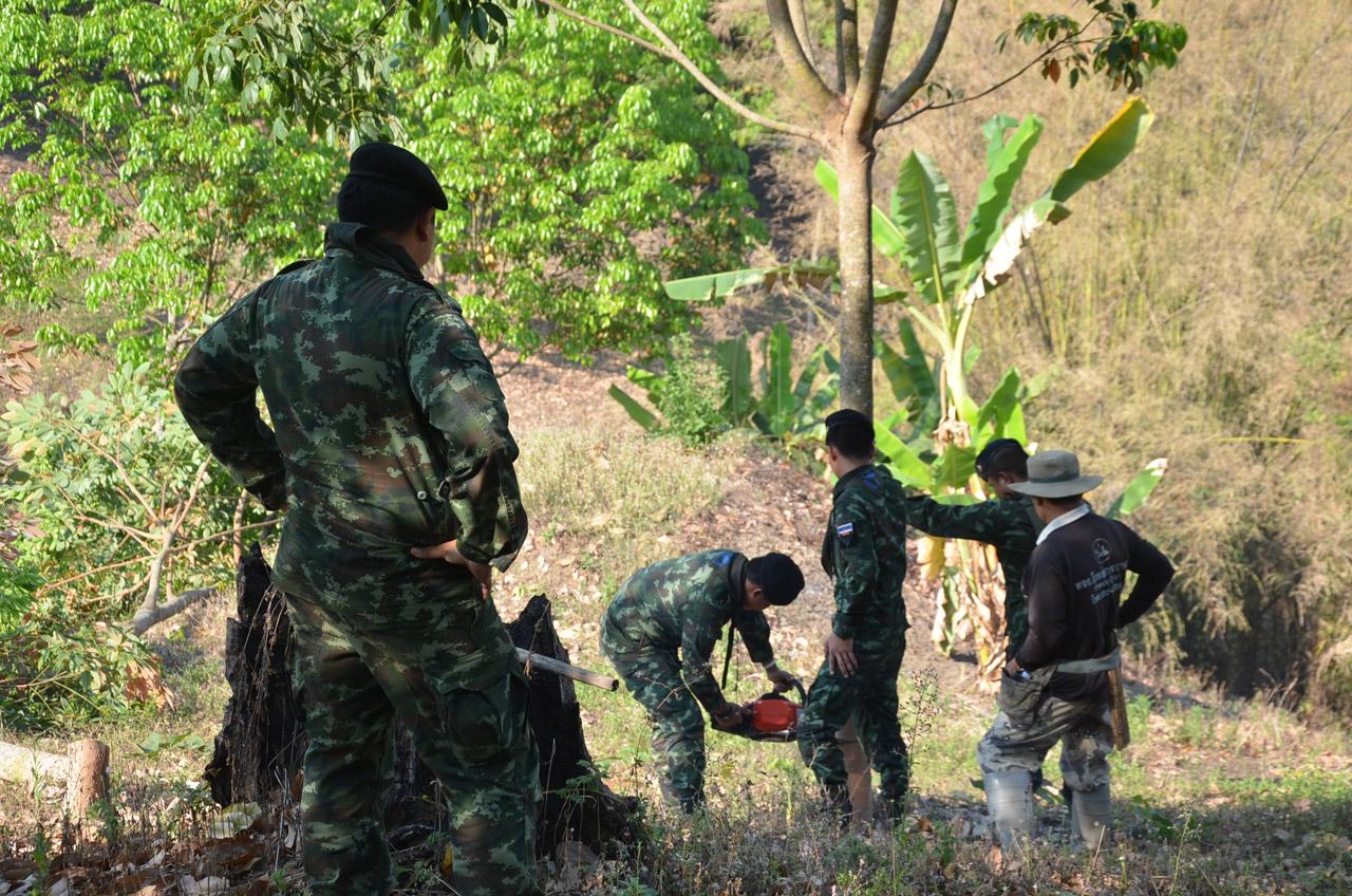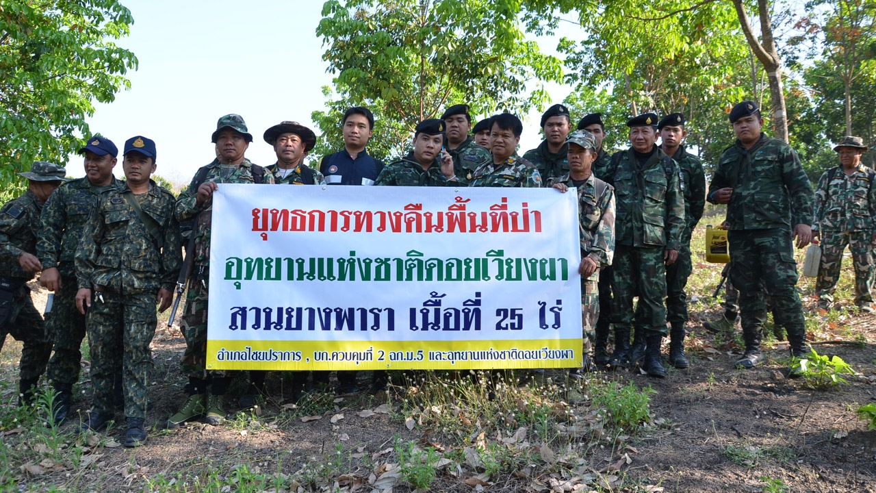 เมื่อเวลา 09.30 น. 5 มี.ค.58 นายกิตติ ตุลพงศ์ เจ้าพนักงานป่าไม้ชำนาญการ กรมอุทยานแห่งชาติสัตว์ป่าและพันธุ์พืช นำกำลัง จนท.อุทยานดอยเวียงผา สนธิกำลัง ทหาร กกล.ผาเมือง โดย พ.ท.ธนพล วงษ์สวัสดิ์ ผบ.บก.ควบคุมที่ 2 ฉก.ม. 5 พร้อมกำลังทหาร จนท.อุทยานฯ อส. จำนวน 40 นายเดินทางเข้าพื้นที่ บ.เชียงหมั้น ม.15 ต.ศรีดงเย็น อ.ไชยปราการ จ.เชียงใหม่ เข้าตรวจสอบการบุกรุกป่าอุทยานดอยเวียงผา เพื่อปลูกยางพารา ซึ่งมีพื้นที่บุกรุกจำนวน 2 แปลงพื้นที่รวม 25 ไร่ เมื่อ จนท.ไปถึงพบต้นยางพาราปลูกเต็มพื้นที่ สภาพอายุประมาณ 5 ปี จึงได้ร่วมกันทำลายต้นยางพาราเพื่อจะได้ดำเนินการปลูกป่าทดแทนในพื้นที่ถูกบุกรุก ขณะเข้าทำการขอคืนพื้นที่ไม่ปรากฏเจ้าของ หรือผู้ครอบครองแต่อย่างใด แต่ก่อนหน้าได้มีการประสานขอคืนพื้นที่ไปก่อนหน้าแล้ว ซึ่งทางผู้บุกรุกยินดีคืนพื้นที่ปลูกยาโดยไม่มีข้อแม้ใดๆ.