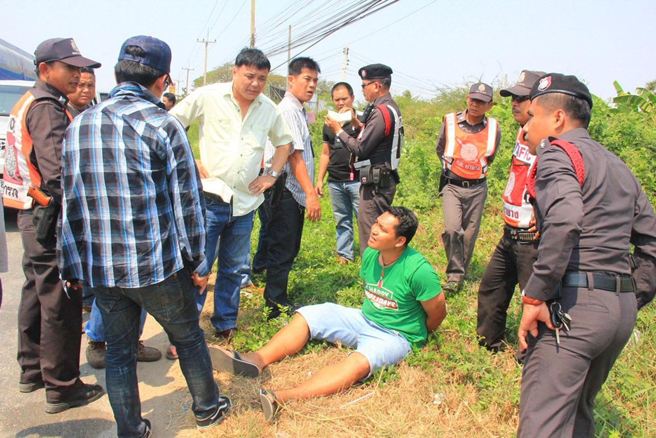 ต่อมาเวลา 13.40 น. พ.ต.อ.พีระพจน์ ได้เข้าตรวจสอบพบรถกระบะวีโก้ สี่ประตู สีบรอนซ์ทอง หมายเลขทะเบียน ศช 1877 กรุงเทพมหานคร ซึ่งต้องสงสัยเป็นผู้ก่อเหตุตามที่ได้รับแจ้ง จึงประสานเจ้าหน้าที่ตำรวจชุดสืบสวน สภ.ท่ายาง ขับสะกดรอยติดตามและปิดล้อมสกัดจับได้ขณะกลับรถบนถนนเพชรเกษมมุ่งหน้าล่องใต้บริเวณหน้าตลาดกลางการเกษตรหนองบ้วย ห่างจากที่เกิดเหตุประมาณ 6 กม.และจับกุมคนขับรถยนต์ได้ทราบชื่อต่อมาคือนายสหรัช ชะนิ่ม อายุ 36 ปี เป็นสมาชิกสภาเทศบาลตำบลบ้านสิงห์ อยู่บ้านเลขที่ 54/6 หมู่ 3 ต.บ้านสิงห์ อ.โพธาราม จ.ราชบุรี เบื้องต้นได้ควบคุมตัวนำตัวไปสอบปากคำแล้ว อยู่ระหว่างการสอบสวน และตรวจพิสูจน์คราบเขม่าดินปืนตามร่างกาย
