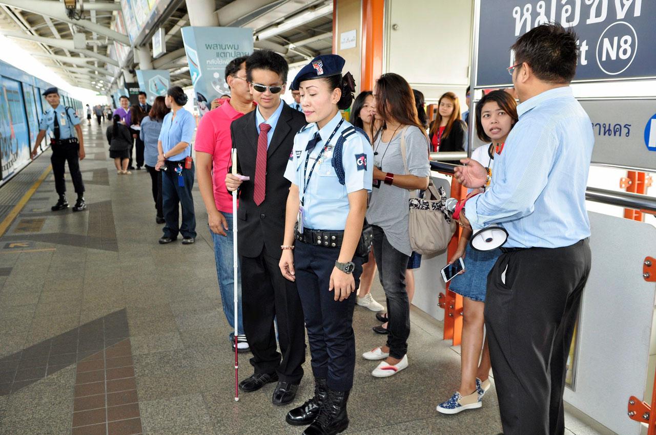 โดยเมื่อปี 2555 ได้เกิดอุบัติเหตุกับผู้พิการทางการมองเห็นสะดุดล้ม ขณะกำลังเข้าใช้บริการภายในสถานีรถไฟฟ้า ทางบริษัทจึงได้หารือกับสมาคมคนตาบอดแห่งประเทศไทย เพื่อร่วมกันวางมาตรการสร้างความปลอดภัยให้กับผู้พิการทางการมองเห็น โดยบริษัทได้จัดอบรมวิธี “การนำทางผู้พิการทางการมองเห็น ในการเดินทางโดยรถไฟฟ้าบีทีเอส อย่างถูกต้องและปลอดภัย” ตามหลักมาตรฐานสากลให้กับพนักงานรักษาความปลอดภัยและเจ้าหน้าที่ทุกสถานี จำนวน 350 นาย