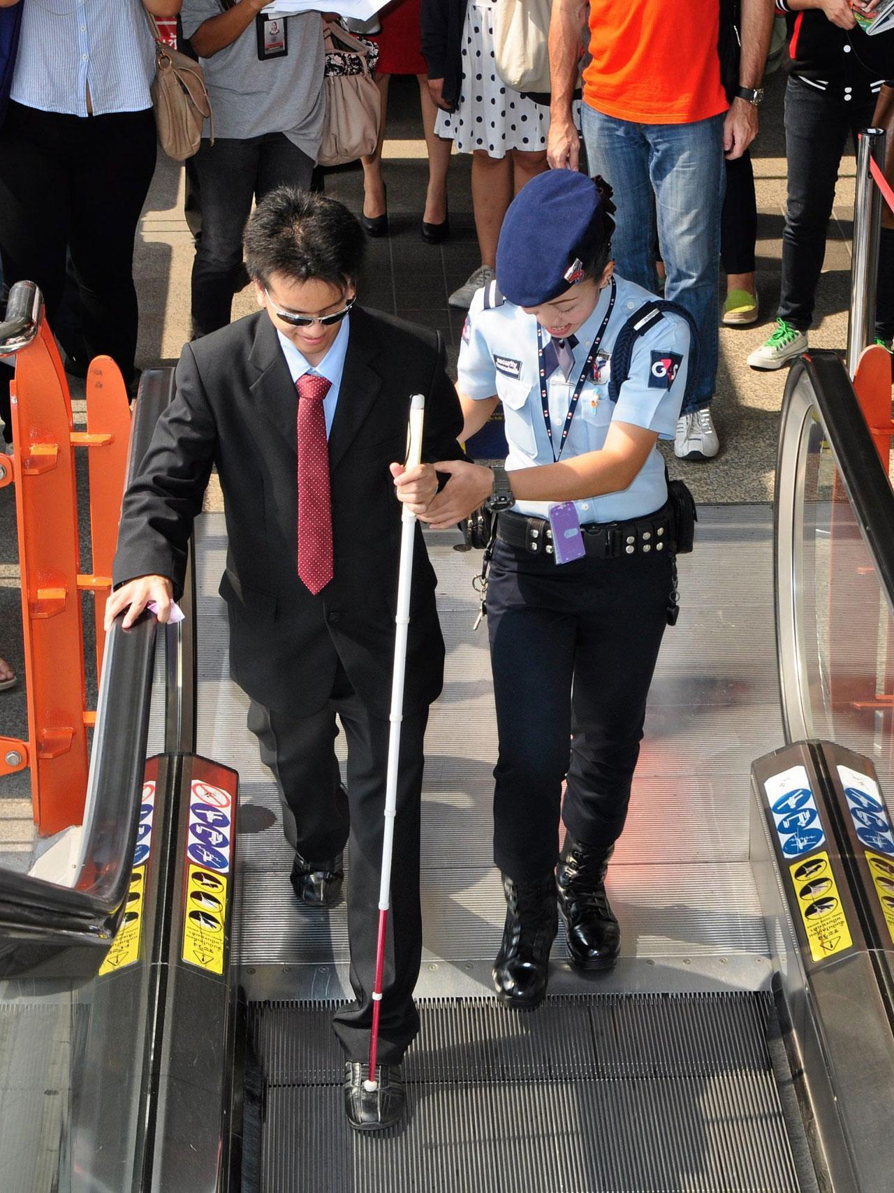 2.ให้เจ้าหน้าที่นำพาผู้พิการขึ้นบันไดเลื่อน เพื่อขึ้นไปยังชานชาลา โดยให้ผู้พิการจับข้อศอกของเจ้าหน้าที่ ซึ่งกรณีนี้เจ้าหน้าที่จะต้องยืนสูงกว่าผู้พิการทางการมองเห็น 1 ขั้น ในกรณีลงบันไดเลื่อน เจ้าหน้าที่จะต้องยืนต่ำกว่าผู้พิการทางการมองเห็น 1 ขั้นเช่นกัน