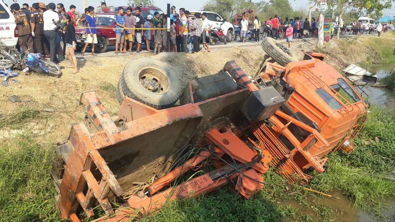 เกิดเหตุสลด...รถบรรทุก 6 ล้อการไฟฟ้า เขต3 อ.นครชัยศรี จ.นครปฐม ชนรถจักรยานยนต์ 2 นร.หญิง ดับคาที่ ร่างเละอัดติดบังโคลนรถ กลางสี่แยกตัดคลองชล ต.ห้วยขวาง อ.กำแพงแสน ขณะที่คนขับยังหายสาบสูญ