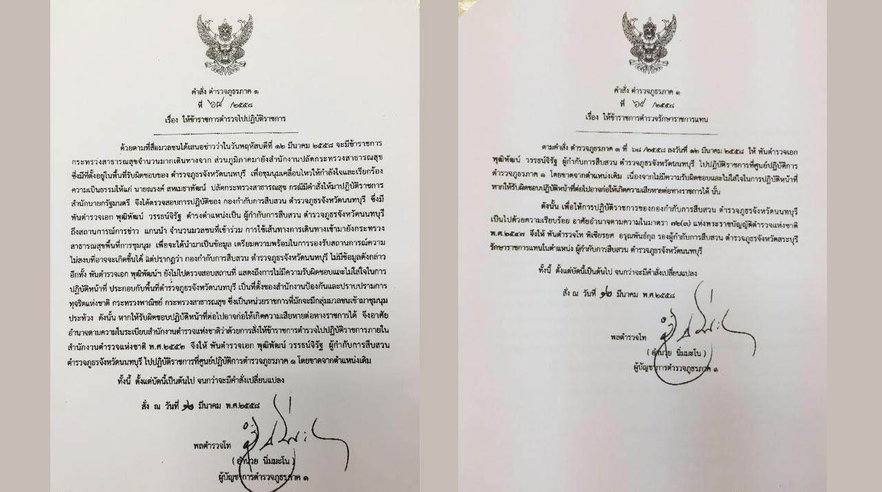 ดังนั้น จึงอาศัยอำนาจตามความในระเบียบสำนักงานตำรวจแห่งชาติ ว่าด้วยการสั่งให้ข้าราชการตำรวจไปปฏิบัติราชการในสำนักงานตำรวจแห่งชาติ พ.ศ. 2552 จึงให้ พ.ต.อ.พุฒิพัฒน์ วรรธน์จิรัฐ ผู้กำกับการสืบสวน ตำรวจภูธรจังหวัดนนทบุรี ไปปฏิบัติราชการที่ศูนย์ปฏิบัติการตำรวจภูธรภาค 1 โดยขาดจากตำแหน่งเดิม ทั้งนี้ ตั้งแต่บัดนี้เป็นต้นไป จนกว่าจะมีคำสั่งเปลี่ยนแปลง ลงวันที่ 12 มี.ค. 58