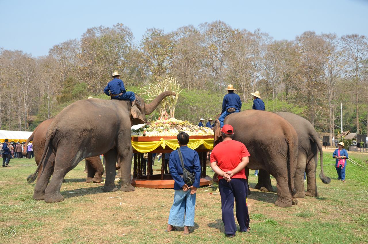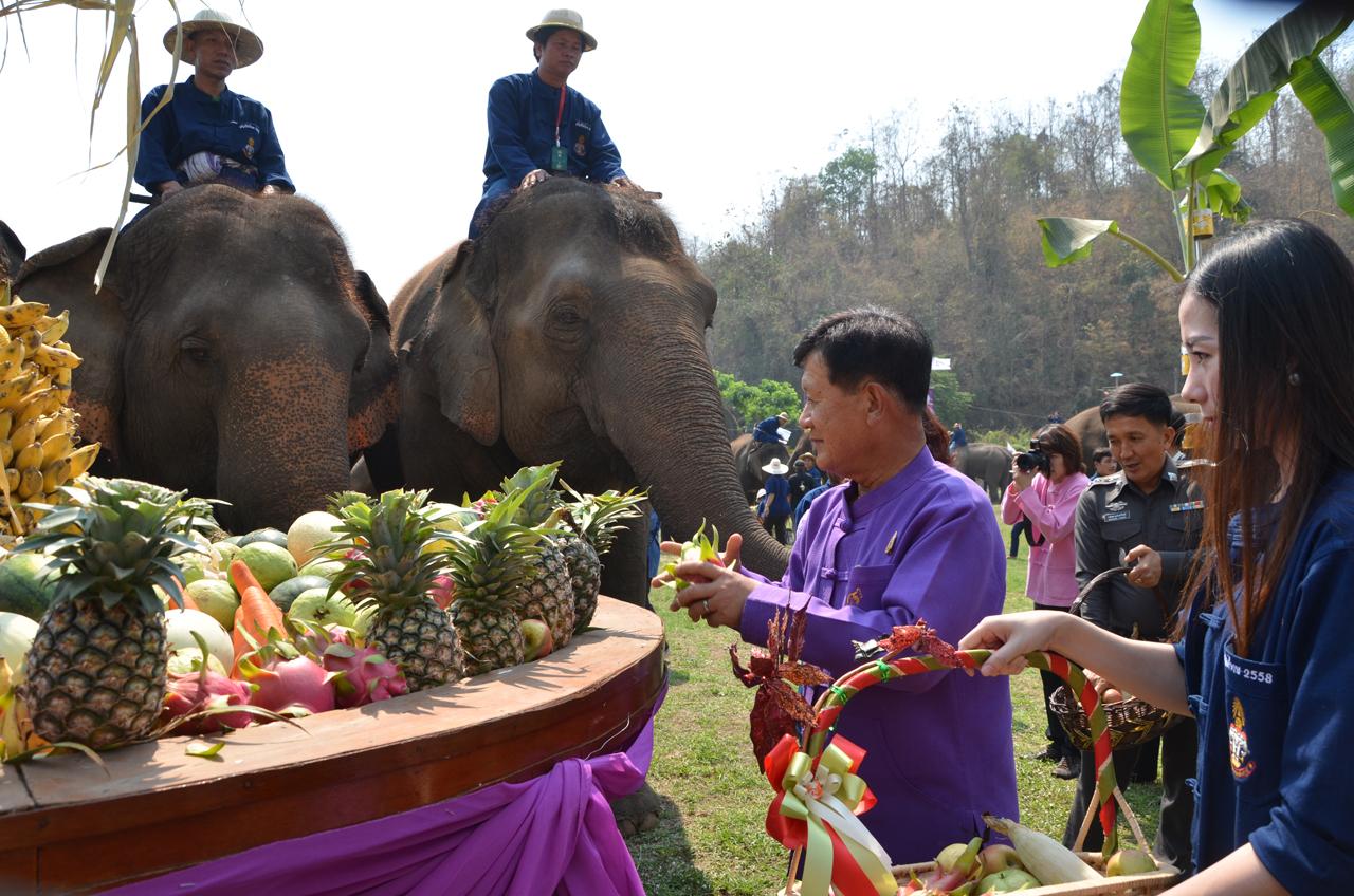 ทั้งนี้ ได้จัดพิธีฮ้องขวัญช้าง ตามวิธีเมืองล้านนาเพื่อเป็นการสืบชะตาต่ออายุของช้างให้ยืนยาวอยู่ดีมีสุข จากนั้นควาญช้างได้นำช้างเดินเข้าสนามที่มีขันโตกวางเรียงรายเต็มสนาม เพื่อนำช้างมากินผลไม้ ท่ามกลางประชาชนและนักท่องเที่ยวต่างนำผลไม้กระเช้าผลไม้มามอบให้ช้างกินและถ่ายรูปคู่กับช้างในบรรยากาศที่สนุกสนาน