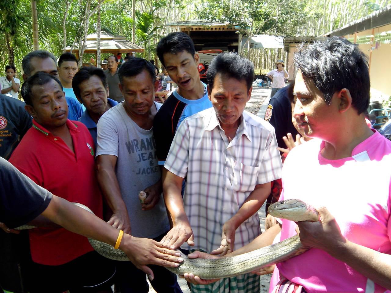 ขณะเดียวกัน ชาวบ้านได้เอาแป้งมาทาที่ตัวงู โดยเชื่อว่าเป็นงูทวด หรืองูเจ้าที่ พร้อมกับตีเป็นเลขต่างๆ เนื่องจากใกล้วันออกสลากกินแบ่งรัฐบาล และตั้งแต่ต้นปีเจ้าหน้าที่ได้จับงูจงอางได้ปล่อยคืนสู่ธรรมชาติแล้ว 4 ตัว.