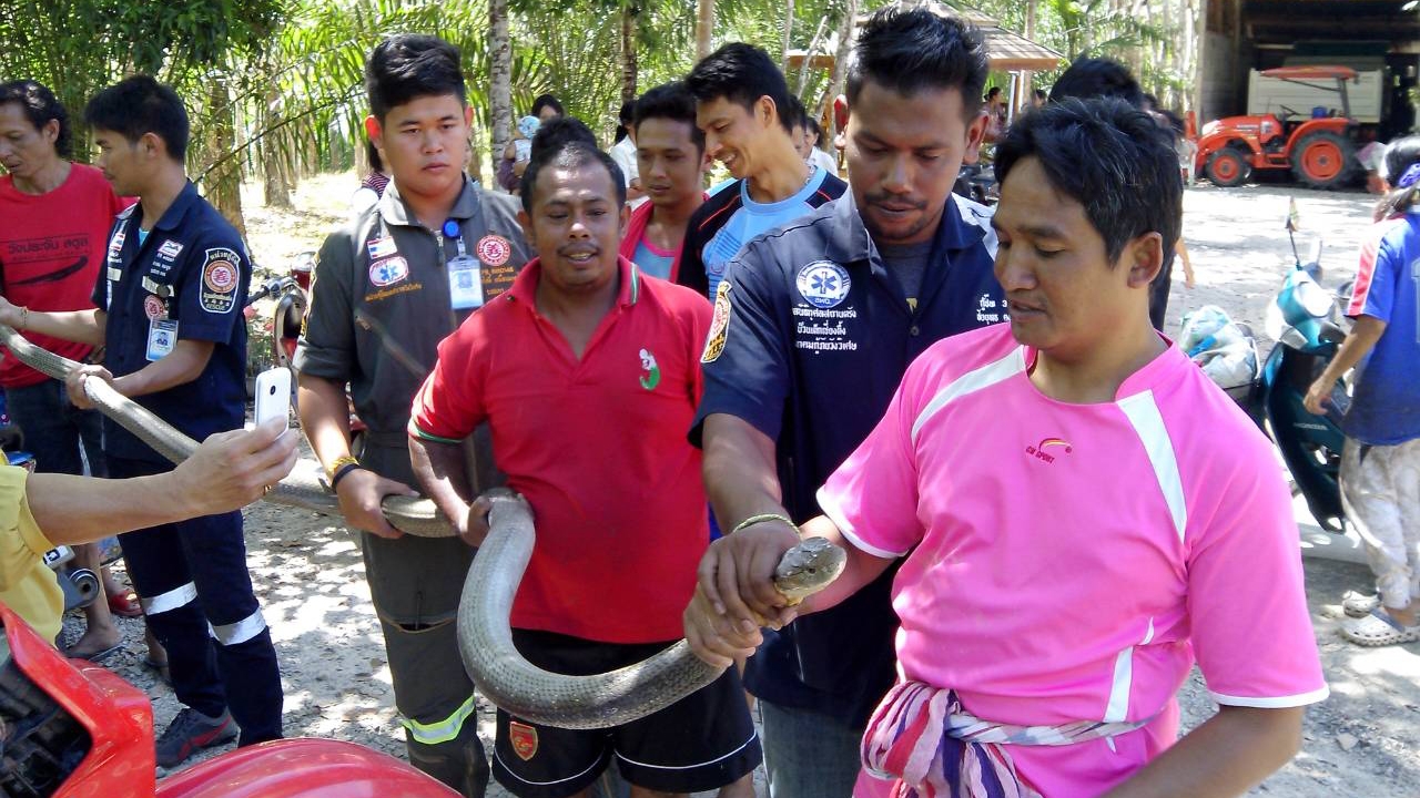 จนท.มูลนิธิกุศลสถานอำเภอห้วยยอด จ.ตรัง ช่วยชาวบ้านจับงูจงอาง ยาว 4 เมตร เชื่อเป็นงูทวดหรืองูเจ้าที่ นอนขดอยู่ในห้องเก็บของหลังบ้าน ขณะที่ชาวบ้านแห่ไปดูจำนวนมาก พร้อมตีเลขเด็ดเนื่องจากใกล้วันหวยออก...
