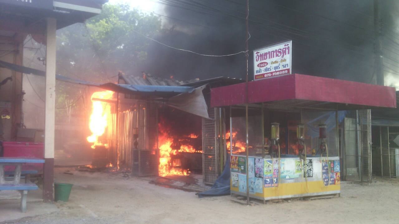 ที่เกิดเหตุ พบไฟลุกไหม้รถกระบะอีซูซุ สี่ประตู สีบรอนซ์เงิน ทะเบียน กฉ 9828 นครศรีธรรมราช ที่ท้ายกระบะหลังมีถังน้ำมันขนาด 200 ลิตร 2 ถังภายในมีน้ำมันดีเซล และเบนซิน จำนวนหนึ่ง นอกจากนี้ยังพบถังน้ำมันขนาด 200 ลิตร อีกจำนวน 22 ถัง วางอยู่หลังร้านภายในถังมีน้ำมันบรรจุอยู่หลายชนิดได้ถูกเพลิงเผาผลานจนหมด เจ้าหน้าที่ดับเพลิงจึงได้ช่วยกันระดมฉีดน้ำเพื่อสกัดไม่ให้เพลิงลุกไหม้ไปติดบ้านข้างเคียง ระหว่างที่กำลังระดมฉีดน้ำมีเสียงถังน้ำมันระเบิดอยู่หลายครั้งเศษวัสดุในกองเพลิงได้กระเด็นกระจายออกมาข้างนอกจำนวนมากใช้เวลากว่า 20 นาที เพลิงจึงสงบ เบื้องต้นประเมินค่าความเสียกว่า 1 ล้านบาท