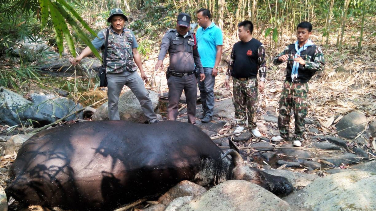 เมื่อเวลา 08.00 น. วันที่ 20 มี.ค. 58 นายอดุล ทำไธสง หัวหน้าอุทยานแห่งชาติเฉลิมพระเกียรติไทยประจัน จ.ราชบุรี นายประทีป เหิมพยัคฆ์ หัวหน้าเขตรักษาพันธุ์สัตว์ป่าแม่น้ำภาชี พร้อมด้วยเจ้าหน้าที่ตำรวจ สภ.บ้านคา ปศุสัตว์ อ.บ้านคา และเจ้าหน้าที่ทหารจาก ช.พัน.111 กรมการทหารช่างราชบุรี เดินทางเข้าตรวจสอบซากกระทิงป่า ที่ได้รับแจ้งจากชาวบ้านว่าถูกยิงเสียชีวิตอยู่ในลำห้วย บริเวณ ม.5 ป่าพุหวาย ต.บ้านบึง อ.บ้านคา จ.ราชบุรี ในเขตป่าอุทยานแห่งชาติเฉลิมพระเกียรติไทยประจัน จากการตรวจสอบทราบว่าเป็นกระทิงป่า เพศเมีย น้ำหนักประมาณ 500-600 กก. ถูกอาวุธปืนยิงตายมาแล้วประมาณ 3 วัน