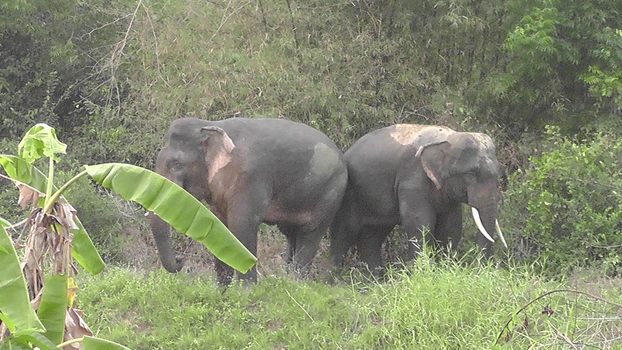 จากการตรวจสอบของเจ้าหน้าที่อุทยานพบว่า ช้างทั้ง 2 ตัว มีงาสวยงาม แต่เจ้าหน้าที่ยังไม่สามารถผลักดันช้างทั้ง 2 ตัว ออกจากป่าละเมาะได้ เนื่องจากสภาพอากาศที่ร้อนจัด ประกอบกับมีประชาชนมุงดูจำนวนมากและส่งเสียงดัง ทำให้การผลักดันช้างครั้งนี้ อาจเกิดอันตรายกับประชาชนได้ ทางเจ้าหน้าที่จึงคอยดูช้างให้อยู่ในผืนป่าละเมาะ ข้างถนนในหมู่บ้าน และจะมีการเข้าไปผลักดันช้างกลับผืนป่าภายในช่วงค่ำวันนี้