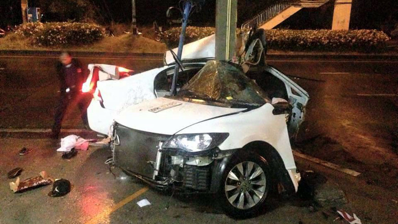 หนุ่มเบญจเพศซิ่งเก๋งฝ่าสายฝน จะไปรับแฟน ชนเข้าอย่างจัง จยย.หญิงสาวดับคาที่ และยังไถลฟาดเสาไฟฟ้าจนเก๋งขาดครึ่ง จนตัวเองเสียชีวิตคาซากรถ...