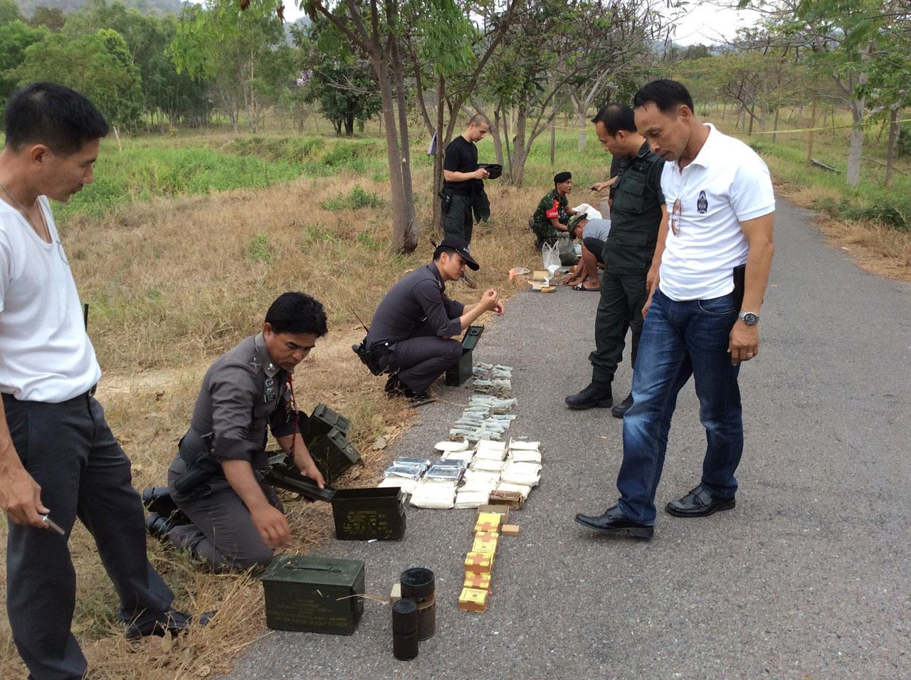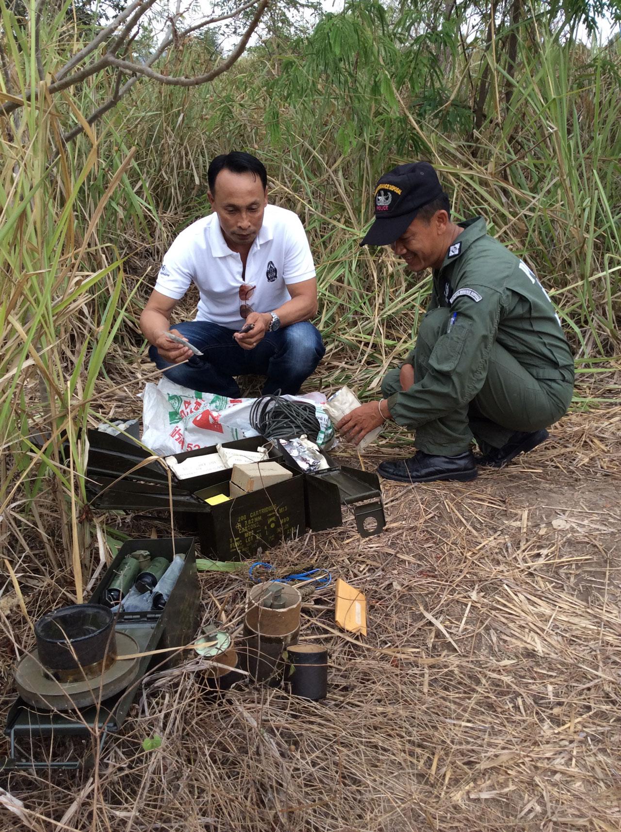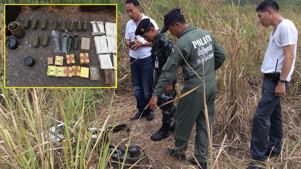 ที่เกิดเหตุ พบวัตถุระเบิด พร้อมเครื่องกระสุนปืนสงครามจำนวนมาก บรรจุอยู่ในกระสอบสีขาว และสีเขียว สำหรับทำบังเกอร์ทหารจำนวน 7 ถุง กองอยู่ใกล้ๆ กัน เจ้าหน้าที่อีโอดี จึงได้ทำการตรวจสอบ พบเป็นระเบิด ระเบิดซีโฟร์ ระเบิดทีเอ็นที ฝักแคระเบิด ระเบิดเพลิง ระเบิดแก๊สน้ำตา ระเบิดควัน พลุส่องสว่าง ชนวนจุดระเบิดไฟฟ้าชนวนจุดระเบิดแบบธรรมดา ตัวจุดจุดชนวนแบบ M3 M4 M5 กระสุนปืน M16 และกระสุนปืนอาก้า ในกล่องเหล็ก ซึ่งที่กระสอบมีข้อความเขียนไว้ว่า ร้อย 1 พัน 1