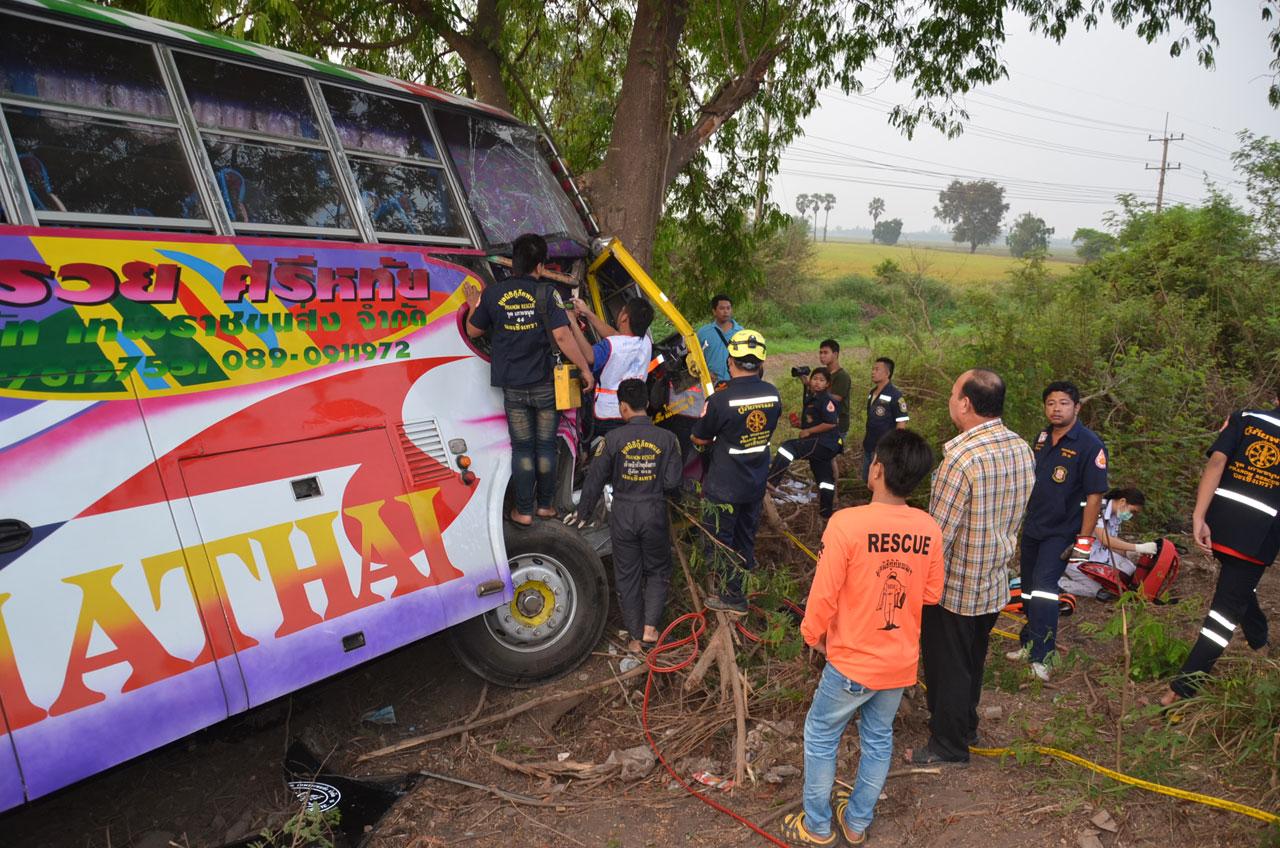 ที่เกิดเหตุเป็นถนน 4 เลน พบรถบัสยี่ห้อฮีโน่ ลายการ์ตูนสีชมพู ทะเบียน 30-0866 ฉะเชิงเทรา จอดเสียหลักตะแคงตกลงข้างทาง ชนอัดกับต้นไม้ขนาดใหญ่ สภาพด้านหน้าพังยับเยิน ภายในรถพบคนขับถูกอัดก๊อบปี้ ติดอยู่กับที่นั่งคนขับ เจ้าหน้าที่ต้องใช้เครื่องมือตัดถ่างเข้าช่วยเหลือ ใช้เวลาประมาณ 1 ชม. จึงสามารถช่วยออกมาได้ จากนั้นได้เร่งนำส่ง รพ.พนมสารคาม ก่อนเสียชีวิตในเวลาต่อมาเนื่องจากอาการสาหัส ทราบชื่อคือ นายเล็ก ด้วงทอง อายุ 57 ปี อยู่บ้านเลขที่ 65 หมู่ 6 ต.บางปลาร้า อ.บ้านสร้าง จ.ปราจีนบุรี
