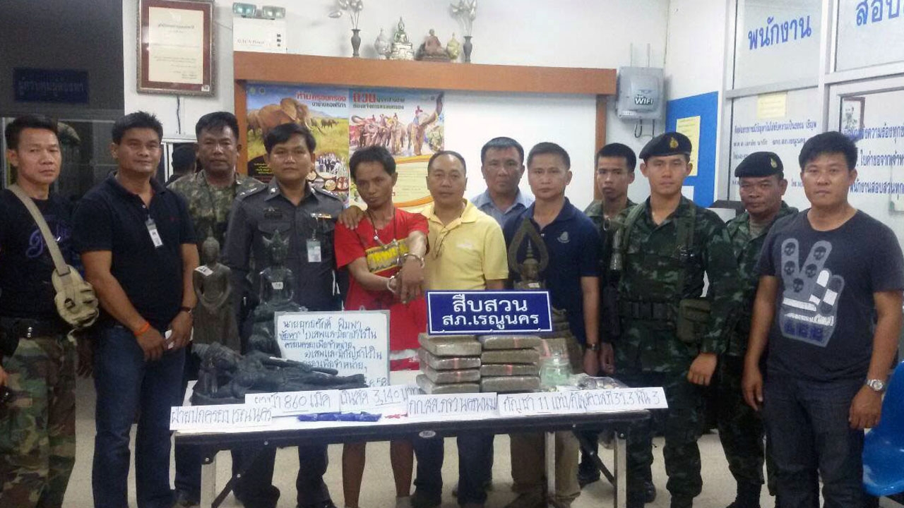ทั้งนี้ ผู้ต้องหาคือ นายยุทธศักดิ์ พิมพา อายุ 48 ปี ชาวบ้าน บ้านนาถ่อน หมู่ 1 ต.นาถ่อน อ.ธาตุพนม จ.นครพนม ยึดของกลางยาบ้าจำนวน 860 เม็ด กัญชาอัดแท่ง 11 แท่ง น้ำหนักรวม 11 กิโลกรัม อุปกรณ์การเสพหลายรายการ จักรยานยนต์ฮอนด้า สีเหลืองดำ ทะเบียน กข 9362 นครพนม จำนวน 1 คัน เงินสดจำนวน 3,140 บาท โทรศัพท์มือถือ 1 เครื่อง และพระเครื่อง พระพุทธรูปโบราณ อีกหลายรายการ ประกอบด้วย พระพุทธรูปปางต่างๆ ทั้งเก่าและใหม่ ขนาดหน้าตักตั้งแต่ 5- 20 นิ้ว จำนวน 116 องค์ และพระเครื่องรุ่นต่างๆ 440 องค์
