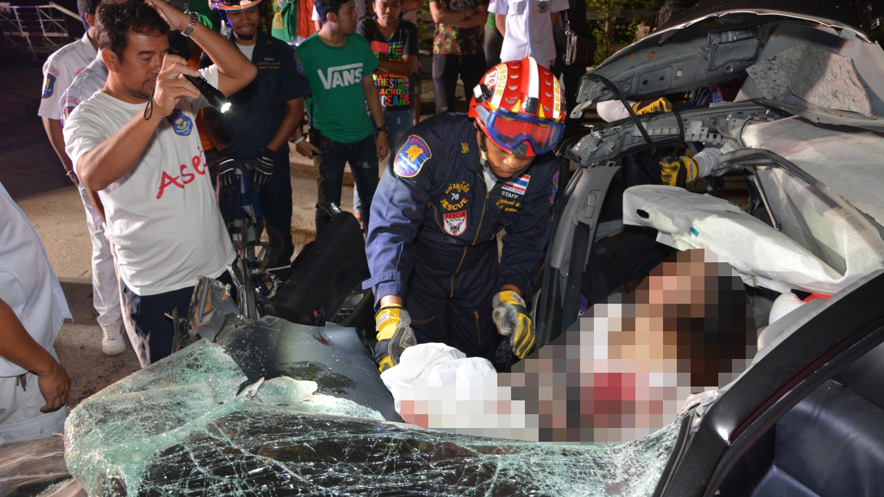 ที่เกิดเหตุพบรถเก๋ง โตโยต้า วีออส สีเทา ทะเบียน 1 กม 507 กรุงเทพมหานคร สภาพพังยับเยินทั้งคัน มีผู้เสียชีวิตคารถ 1 ราย ทราบชื่อต่อมา น.ส.กัลยารัตน์ คนหาญ อายุ 27 ปี อยู่เลขที่ 142/134 ม.7 ต.สุรศักดิ์ อ.ศรีราชา จ.ชลบุรี สภาพศพสวมชุดแซกสีขาวลายดอกไม้ กะโหลกศีรษะแตก เลือดไหลนองเสียชีวิตคาที่ เจ้าหน้าที่กู้ภัย จึงใช้เครื่องตัดถ่าง ช่วยกันนำร่างผู้เสียชีวิตออกจากตัวรถ