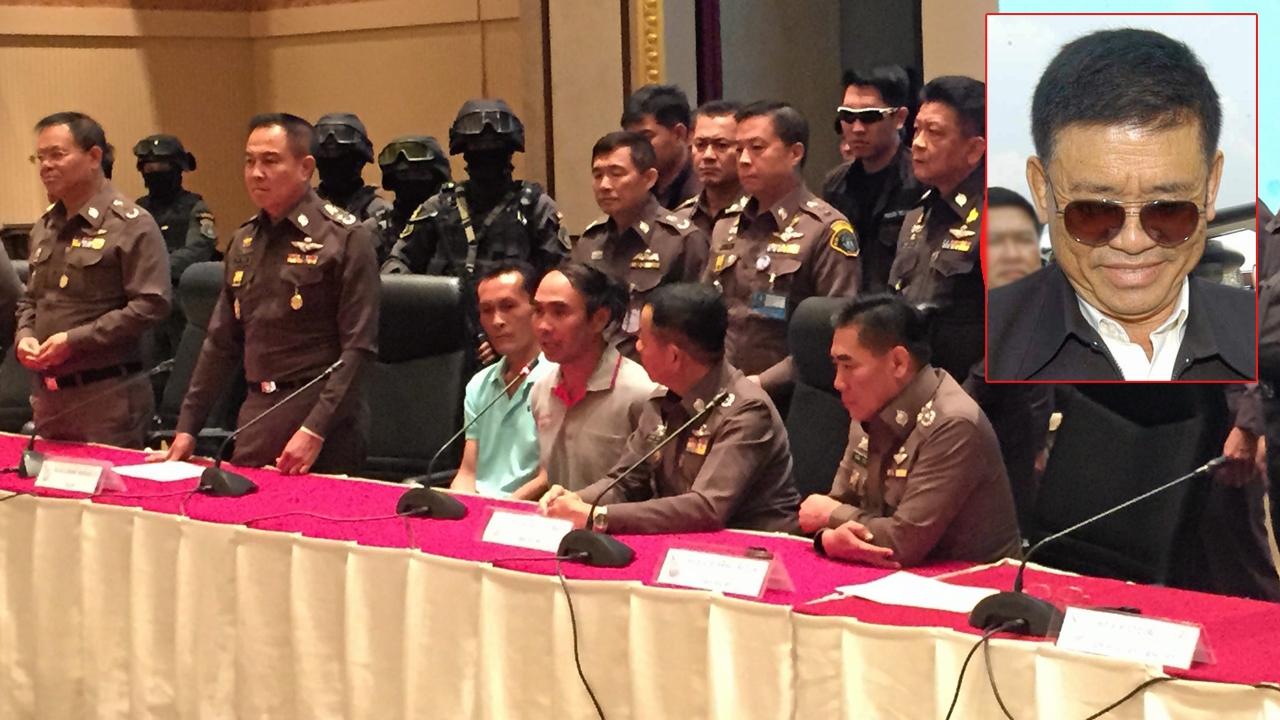พล.ต.อ.สมยศ พุ่มพันธุ์ม่วง ผบ.ตร. แถลงผลจับกุม ด.ต.ชาญชัย สร้อยสังวาลย์ นายบุญนาค หงษาคำ แก๊งฆ่าพระหมอ ที่สำนักงานตำรวจแห่งชาติ โดยนายบรรเจิด ฉัตรไพฑูรย์ หรือเสี่ยบั๊ก (รูปเล็ก) ผู้บงการ ไม่ร่วมแถลงข่าว.