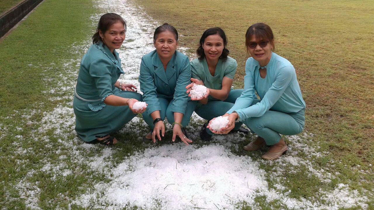 ฝนฟ้าปรวนแปร เกิดพายุฝนตกหนักในพื้นที่ จ.นครราชสีมา บางแห่งมีลูกเห็บแถมมาด้วย ตกกองขาวโพลนบนพื้นหญ้า ทำชาวบ้านแตกตื่น ส่วนคนที่ผ่านมาเจอก็พลอยตื่นเต้นไปด้วย...