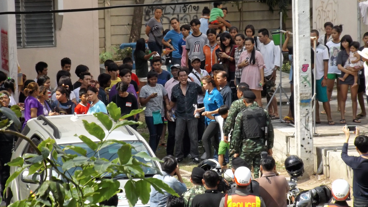 ชาวบ้านกว่า 100 คน ยืนเผชิญหน้ากับเจ้าหน้าที่ตำรวจ-ทหาร ที่ควบคุมตัวนายอานนท์ พิมพ์หนู อายุ 29 ปี พ่อเลี้ยงโหด ไปทำแผนประกอบคำรับสารภาพที่แฟลตเอื้ออาทรหทัยราษฎร์ หลังทำร้ายหนูน้อยวัย 2 ขวบเสียชีวิต ต้องเจรจากว่า 2 ชม. ก็ยังไม่สามารถเอาผู้ต้องหาลงจากรถไปทำแผนได้ เกรงโดนประชาทัณฑ์ สรุปทำได้เพียงชี้อาคารเกิดเหตุ.