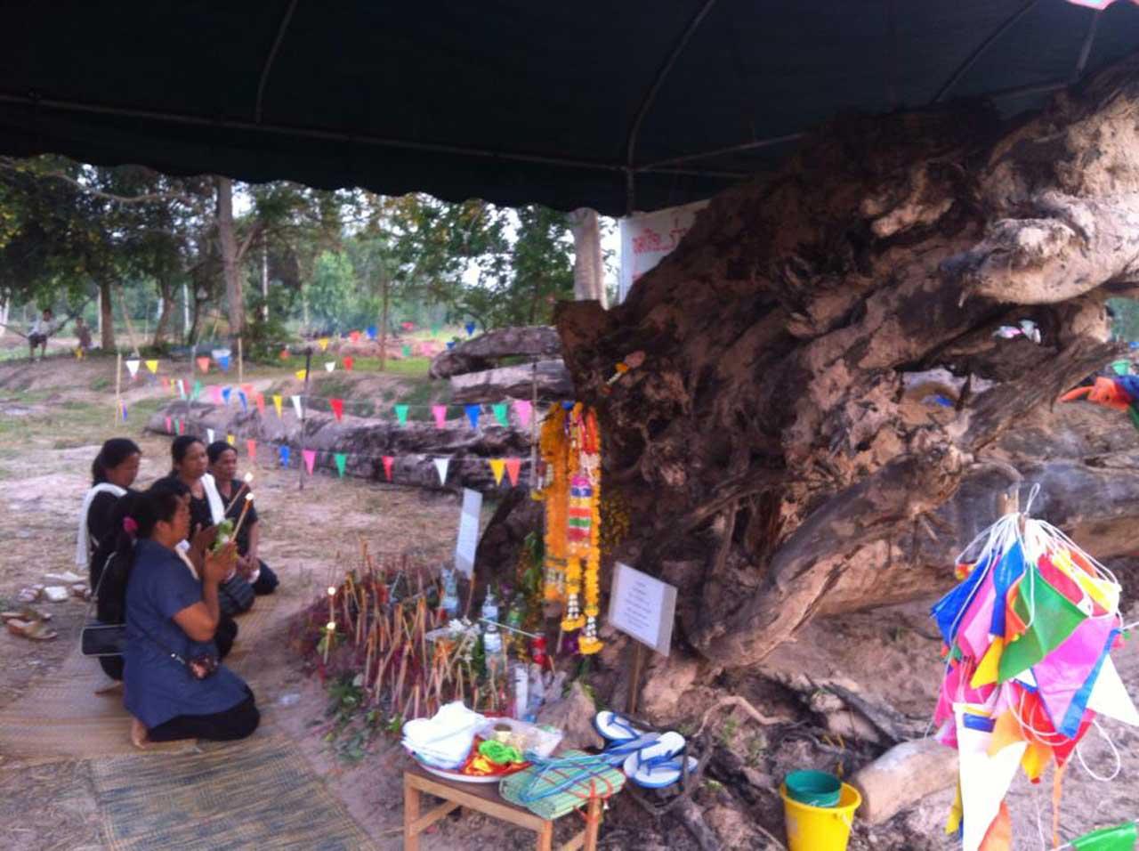 โดยชาวบ้าน เปิดเผยว่า เจ้าหน้าที่ของกรมชลประทานได้ขุดลอกเพื่อทำฝายกั้นน้ำเพื่อใช้ในการเกษตรในหน้าแล้ง โดยก่อนหน้านี้เจ้าหน้าที่ได้ขุดลอกบริเวณเหนือที่พบเจอต้นตะเคียน แต่บริเวณดังกล่าวเป็นโค้งน้ำ เมื่อถึงหน้าน้ำหลากเกรงว่าน้ำจะล้นฝาย จึงขุดถัดลงมาอีก 100 เมตร ระหว่างที่กำลังขุดอยู่นั้นรถแบ็กโฮก็เจอกับตอไม้ขนาดใหญ่ เมื่อตรวจสอบทราบว่าเป็นต้นตะเคียนยักษ์ เส้นรอบลำต้นกว้าง 3.50 เมตร ยาว 11 เมตร เจ้าหน้าที่จึงได้ทำการเคลี่อนย้ายต้นไม้มาไว้ยังที่นาของ นางพนมพร หาโกสีย์ จากนั้นได้เคลี่อนย้ายเครื่องจักรเพื่อไปทำงานยังที่อื่น