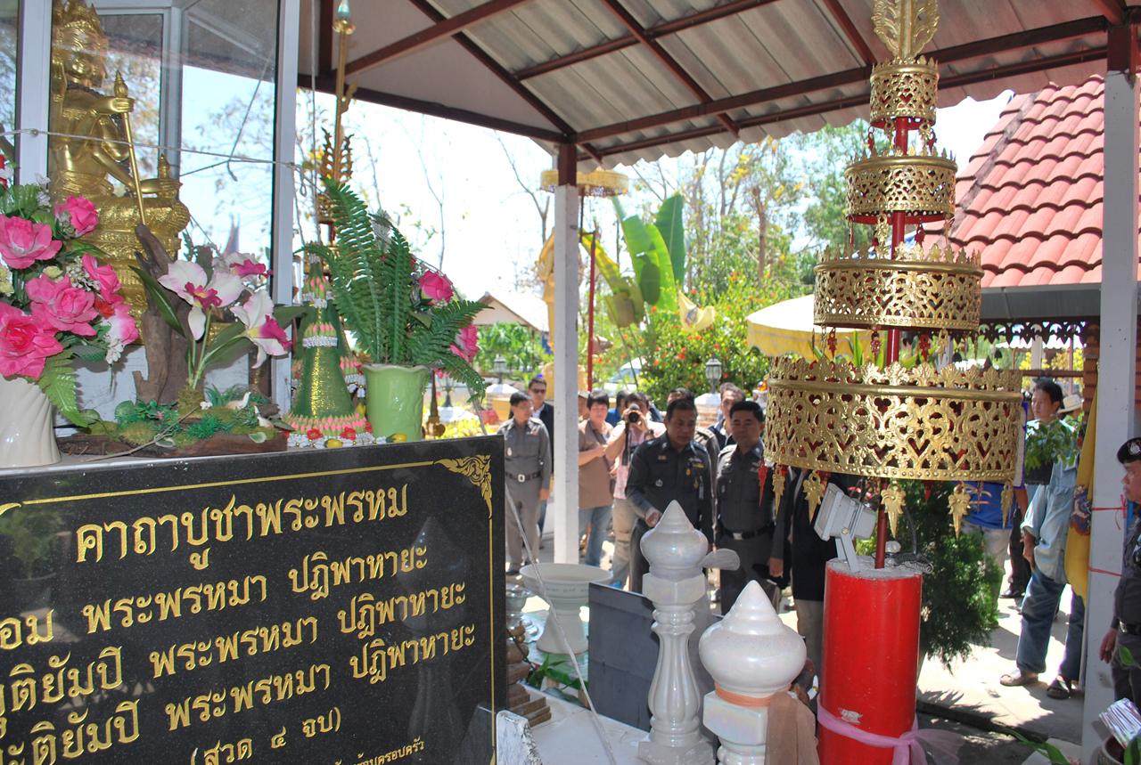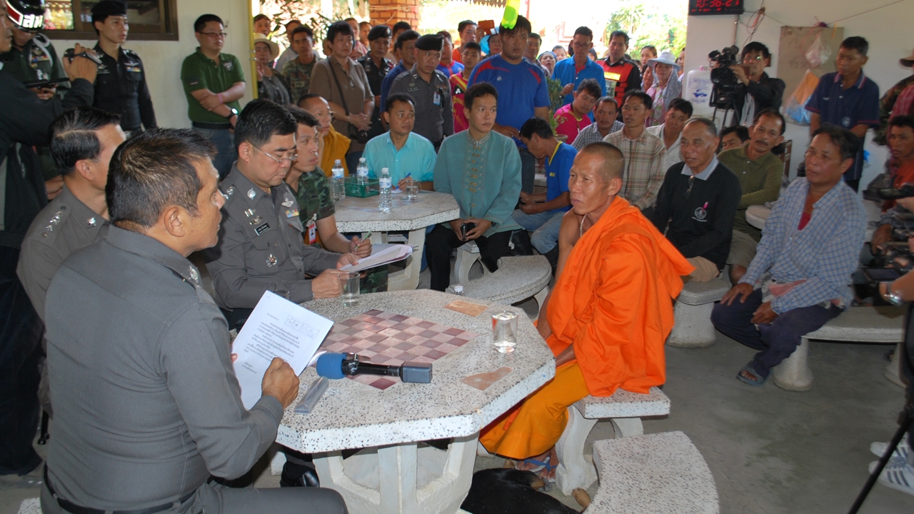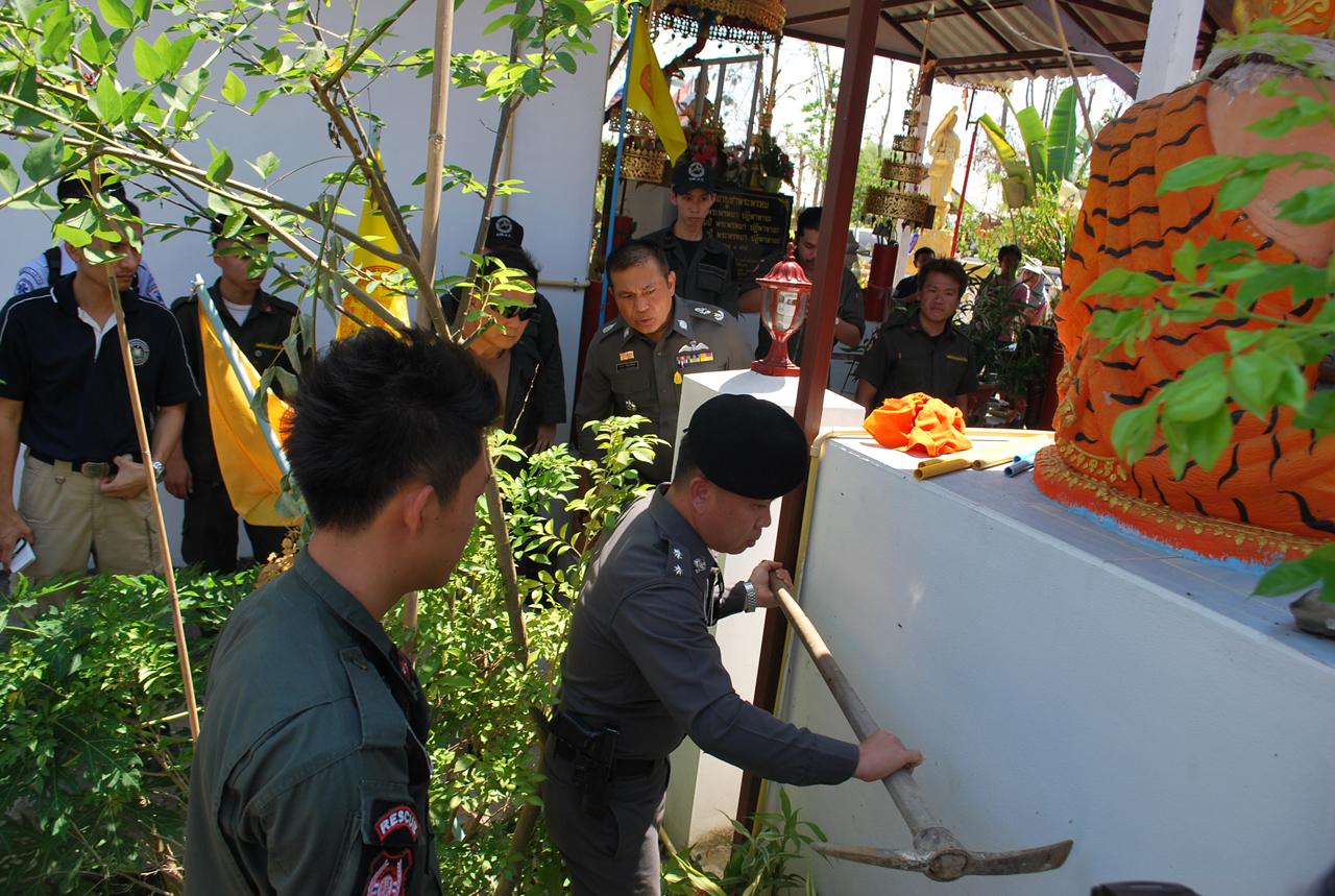 เมื่อ พล.ต.ต.ปชา รัตนพันธ์ รอง ผบช.ภ.5 พร้อมคณะเดินทางไปถึง และแจ้งกับชาวบ้านที่มารวมตัวกันในวัด ทราบว่า จะมีการตรวจหาหลักฐาน โดยการขุดดูฐานพระพรหมและรูปปั้นฤาษี เนื่องจากสงสัยว่า จะมีซากศพเด็กอยู่ในนั้น แต่ชาวบ้านไม่ยอม พร้อมกับฮือเข้าปิดล้อม ไม่ให้เจ้าหน้าที่เข้าไปขุด เนื่องจากหวั่นจะกระทบกับสิ่งปลูกสร้างของวัดที่ชาวบ้านบริจาคเงินมาก่อสร้าง แม้ทางตำรวจจะบอกว่า หลังจากขุดเสร็จแล้วจะทำการกลบปิดทำให้ใหม่เหมือนเดิม แต่ชาวบ้านก็ไม่ยอมโดยบอกว่าต้องให้ อดีตพระเฉลิม มาชี้ยืนยันว่า ฝังไว้ตรงจุดไหนถึงจะให้ขุด จนในที่สุดทางตำรวจต้องล่าถอยออกมา