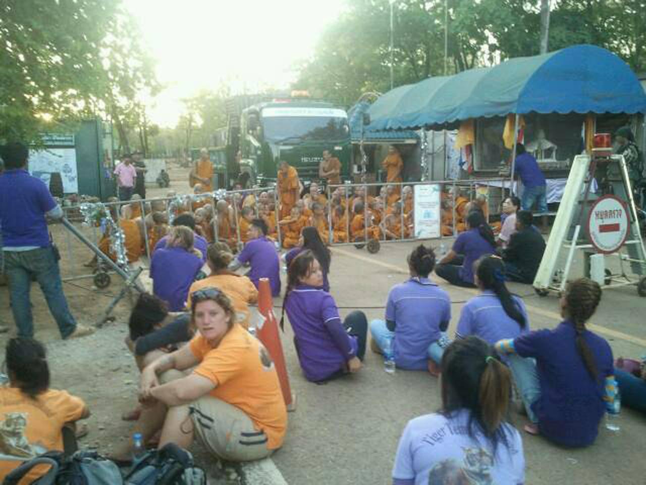 กระทั่งเวลา21.00 น. นายบุญญะพัฒน์ จันทรอุไร รองผวจ.กาญจนบุรี ได้รุดมาเจรจากับทางวัด เพื่ิอให้เปิดทางให้เจ้าหน้าที่เดินทางมาออกมา แต่ทางวัดยืนยันให้นำหมีควายทั้ง6ตัวลงจากรถ กลับไปไว้ที่เดิม ขณะเดียวกันทั้งพระ และญาติโยมที่มาปฏิบัติธรรม ได้นั่งปิดทางออกพร้อมกับสวดมนต์ไปด้วย บรรยากาศยังคงตึงเครียด เป็นการเผชิญหน้ากันของทั้ง 2 ฝ่าย.