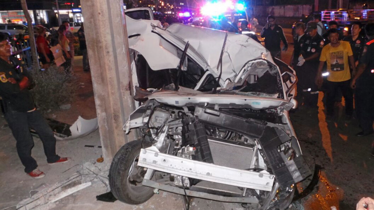 สถาปนิกหนุ่มควบเก๋งพาเพื่อน รวม 7 คนไปส่งบ้าน แต่รถเสียหลัก ชนเสาไฟฟ้าอย่างจัง ตัวเองดับสยองคาที่ ส่วนสาว 17 แฟนเพื่อนรุ่นน้องที่นั่งมาด้วยคอหักดับอนาถรวมเป็น 2 ศพ บาดเจ็บอีก 5 คน ตำรวจสอบพบ ก่อนเกิดเหตุเพิ่งออกมาจากงานเลี้ยงรุ่น มีรถขับตามกันมา 4 คัน ถึงจุดเกิดเหตุอยู่ดีๆรถผู้ตายเสียหลักพุ่งไปชนเสาไฟฟ้าอย่างจัง สงสัยดื่มในงานเลี้ยงไปพอสมควร พอรถเสียหลักเลยเอาไม่อยู่