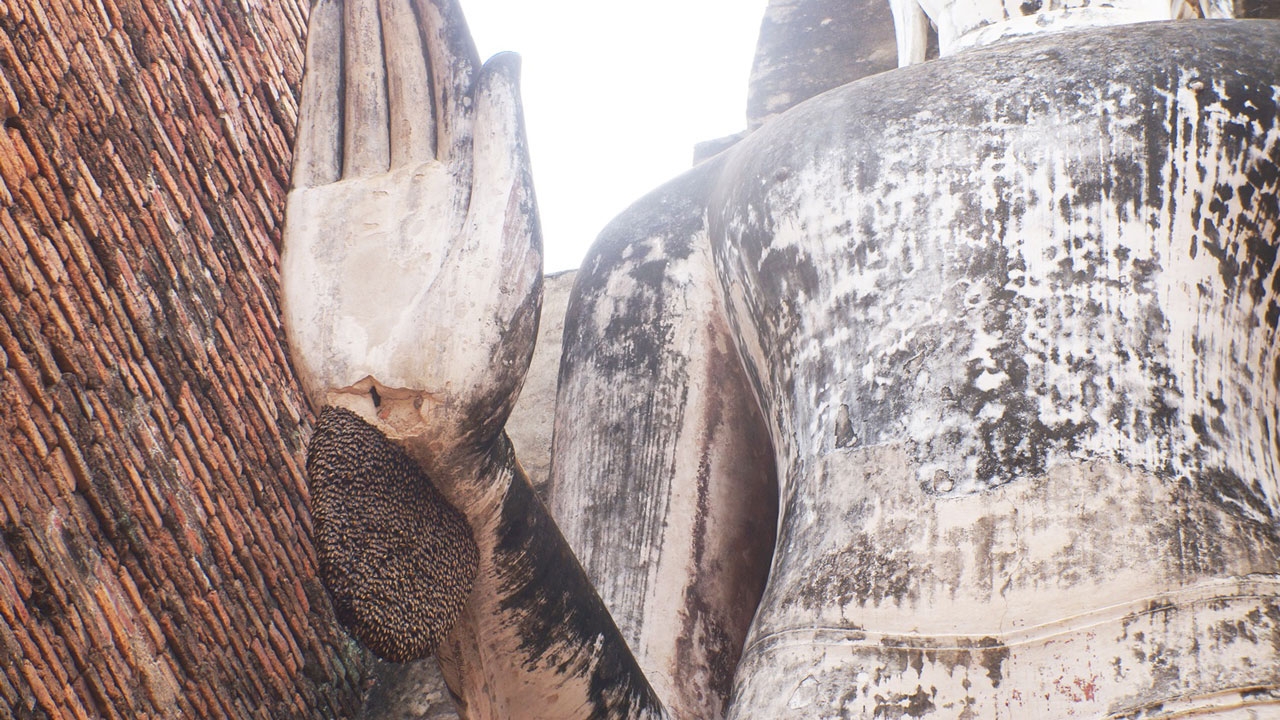ฮือฮา...ชาวสุโขทัยพากันประหลาดใจ ฝูงผึ้งหลวงนับล้านตัว ทำรังขนาดใหญ่ที่พระหัตถ์ขวาของพระอัฏฐารส พระพุทธรูปยืนสูง 18 ศอก ปางประทานอภัย อายุกว่า 700 ปี ที่อุทยานประวัติศาสตร์สุโขทัย เชื่อเป็นมงคล นิมิตหมายที่ดี