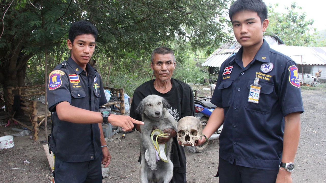 เมื่อวันที่ 11 เม.ย. ร.ต.อ.เอกพัทธ สิทธิศักดิ์ พนักงานสอบสวน สภ.พลูตาหลวง ได้รับแจ้งจาก นายสว่าง พลทะมัย อายุ 59 ปี หรือ ลุงสว่าง ผู้อุทิศชีวิตเลี้ยงดูสุนัขกว่า 30 ตัว ว่าสุนัขได้คาบหัวกะโหลกมนุษย์ มาไว้บริเวณบ้านของตน ซึ่งไม่มีเลขที่ ภายในซอยสุขุมวิท 109 ม.7 ต.พลูตาหลวง อ.สัตหีบ จ.ชลบุรี จึงพร้อมด้วยเจ้าหน้าที่หน่วยกู้ภัยมูลนิธิสว่างโรจนธรรมสถานสัตหีบ รุดไปตรวจสอบ