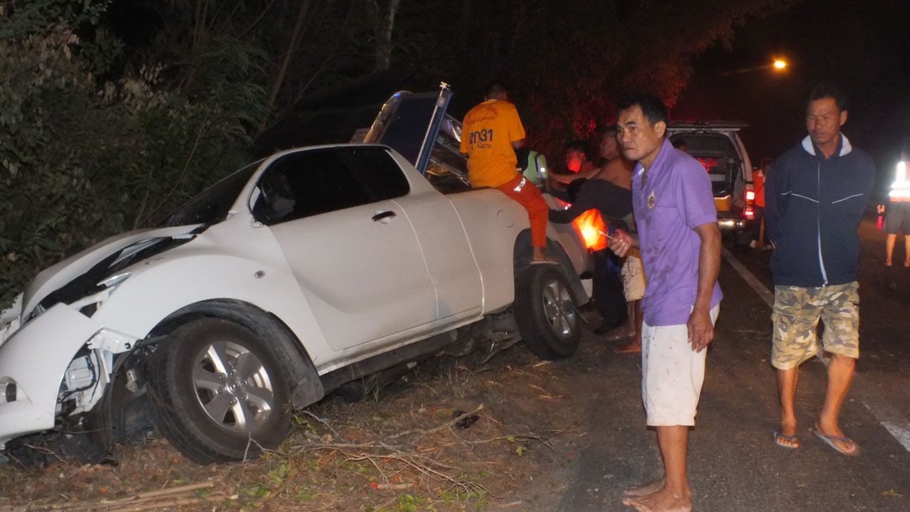 ที่ จ.นครราชสีมา เมื่อเวลา 04.30 น.วันที่ 12 เม.ย.58 พ.ต.ท.วิทยาบุญวัน พนักงานสอบสวน สภ.พิมาย จ.นครราชสีมา ได้รับแจ้งว่ามีเหตุรถกระบะชนต้นไม้ทำให้มีผู้ได้รับบาดเจ็บหลายรายที่บริเวณถนนสายพิมาย-ชุมพวง กม.ที่ 5-6 ม.3 บ้านฉกาดช่องโค ต.รังกาใหญ่ อ.พิมาย จ.นครราชสีมา จึงรุดไปที่เกิดเหตุ พร้อมหน่วยกู้ภัยพิมาย