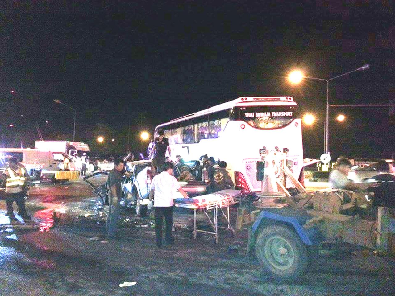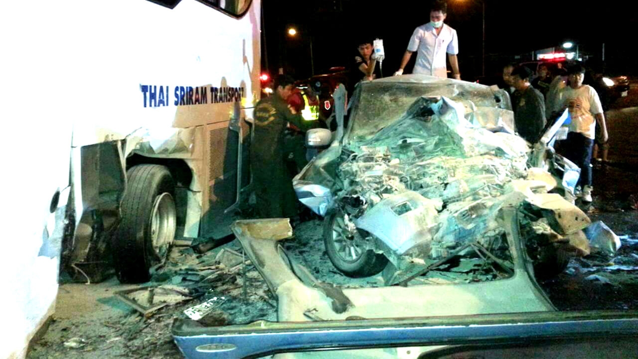 พบรถบัสโดยสาร ยี่ห้อ วอลโว่สีขาว ทะเบียน 30-1855 นครราชสีมา มีนายชำนาญ เฟ้นดี อายุ 49 ปี อยู่บ้านเลขที่ 63/1 หมู่ 12 ต.แขวงแสนแสบ เขตมีนบุรี กทม. เป็นคนขับ และรถยนต์กระบะยี่ห้ออีซูซุ ทะเบียน ตฉ 9184 กทม. มีนายสุเทพ ทองธรรม อายุ 58 ปี อยู่บ้านเลขที่ 40/3 ซอยรามคำแหง 2 เขตประเวศ กทม. เป็นคนขับเสียชีวิต ในที่เกิดเหตุพบรถโดยสารจอดในช่องทางเดินรถขาขึ้น สภาพซุ้มล้อหลังด้านซ้ายได้รับความเสียหาย ส่วนรถกระบะเสียหายทั้งคัน
