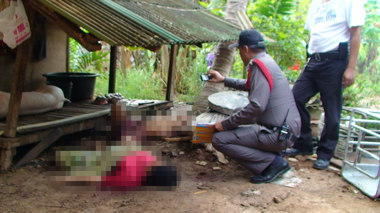 จุดเกิดเหตุอยู่ตรงบริเวณแคร่ไม้ไผ่สำหรับนั่งชำแหละเนื้อสุกร มีสุกรที่ถูกเชือดแล้ว 1 ตัว วางกองอยู่พร้อมกับเครื่องในหมูจำนวนหนึ่ง เพื่อรอส่งให้ลูกค้า ที่พื้นดินติดกับแคร่ไม้ไผ่พบศพนายวรรณ พรหมเวช อายุ 65 ปี อยู่บ้านเลขที่ 77 หมู่ 5 ต.ทุ่งใหญ่ อ.ทุ่งใหญ่ จ.นครศรีธรรมราช สภาพศพมีรอยถูกยิงด้วยปืนลูกซองยาวเข้าที่หน้าท้องจนเป็นรูโบ๋ นอนหงายหน้าจมกองเลือดอยู่ในชุดนุ่งผ้าขาวม้าสีแดง ไม่ใส่เสื้อ ตามร่างกายมีมดคันไฟตัวเล็กขึ้นมาไต่ตอมกัดกินเนื้อตรงบาดแผลเป็นจำนวนมาก ใกล้กันพบศพนางวันเพ็ญ พรหมเวช อายุ 60 ปี เมียของนายวรรณ สภาพศพมีรอยถูกยิงด้วยปืนชนิดเดียวกันเข้าที่ชายโครงซ้ายกระสุนเข้าเป็นกระจุกนับรูกระสุนได้ 7 รู นอนหงายหน้าจมกองเลือดเสียชีวิตอยู่ในชุดนุ่งผ้าถุงลายดอกสีเทา ใส่เสื้อยืดสีแดง ที่เกิดเหตุเจ้าหน้าที่ยังพบรูกระสุนปืนลูกซองที่ยิงไปโดนโอ่งใส่น้ำขนาดใหญ่ห่างจากผู้ตายไปประมาณ 5 เมตร จำนวน 2 รู พบปลอกกระสุนปืนลูกซองยาว 2 ปลอก และเศษหัวกระสุนปืนลูกซองจำนวนหนึ่ง จึงได้เก็บไว้เป็นหลักฐาน