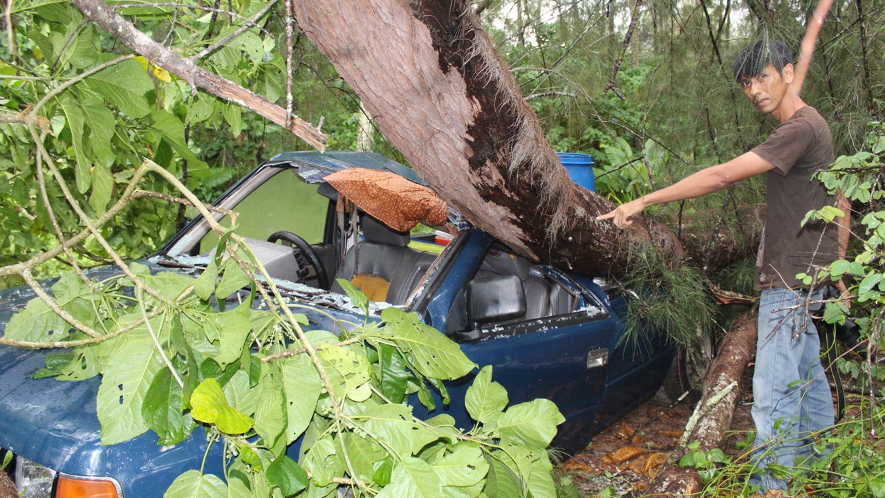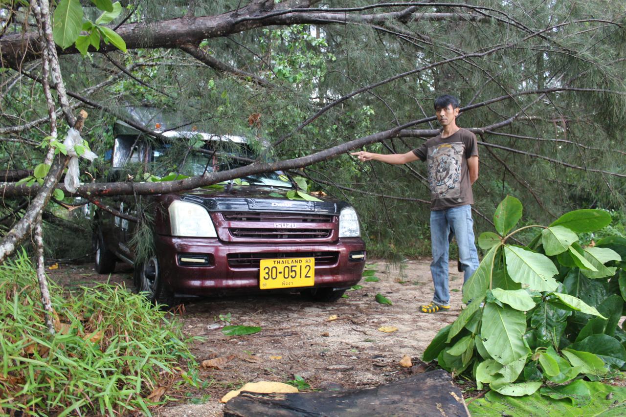 เมื่อเวลา 17.00 น. วันที่ 13 เมษายน ผู้สื่อข่าวรายงานว่า เกิดเหตุพายุฝนพัดกระหน่ำในพื้นที่ชายหาดแหลมปะการัง หมู่ 2 บ้านบางขยะ ต.คึกคัก อ.ตะกั่วป่า จ.พังงา ทำให้ต้นสนขนาดใหญ่ ที่อยู่ที่ริมชายหาดแหลมปะการัง หักโค่นทั้งต้น ล้มทับรถยนต์พังเสียหายจำนวน 2 คัน เป็นรถยนต์ยี่ห้ออีซูซุ สีน้ำเงิน หมายเลขทะเบียน ป 4929 พังงา หลังคารถยุบ กระจกแตกทั้งหมด และรถอีซูซุ สีน้ำตาล หมายเลขทะเบียน 30-0512 พังงา ได้รับความเสียหายที่ฝากระโปงหน้า และหลังคา