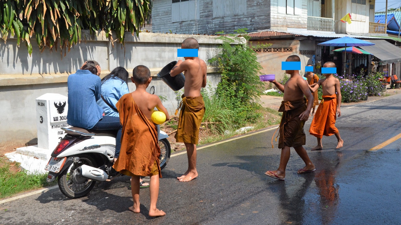 สามเณรกลุ่มหนึ่งร่วมเล่นสาดน้ำฉลองสงกรานต์ ใช้ถังน้ำ และปืนฉีดน้ำใส่ญาติโยมที่ผ่านไปมาอย่างสนุกสนาน ท่ามกลางอากาศร้อนจัด ที่วัดชุมพรบวรรังสิยาราม (บ้านโคกสระแกราช) อ.ปักธงชัย จ.นครราชสีมา.