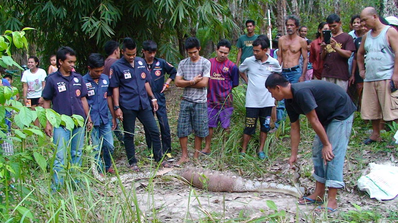 จากการสอบถาม นายคำ คนงานชาวพม่า เผยว่า ขณะที่ตนกำลังถางป่าที่ในสวนยางดังกล่าวอยู่นั้น ก็เหลือบไปเห็นงูเหลือมขนาดใหญ่กำลังกลืนสัตว์ขนาดใหญ่บางชนิดลงไปในท้อง โดยงูเคลื่อนไหวไม่ได้ นอนขดอยู่กับที่ จึงเกิดความกลัว จากนั้นก็รีบวิ่งมาแจ้งให้นายจักรวุฒิ เจ้าของสวนยางทราบ ก่อนที่เจ้าของสวนยางจะแจ้งให้เจ้าหน้าที่มูลนิธิใต้เต็กตึ๊ง นำกำลังพร้อมอุปกรณ์ในการจับงูมาช่วยกันจับ และนำไปปล่อยในป่าใหญ่ เพื่อกลับคืนสู่ธรรมชาติต่อไป.