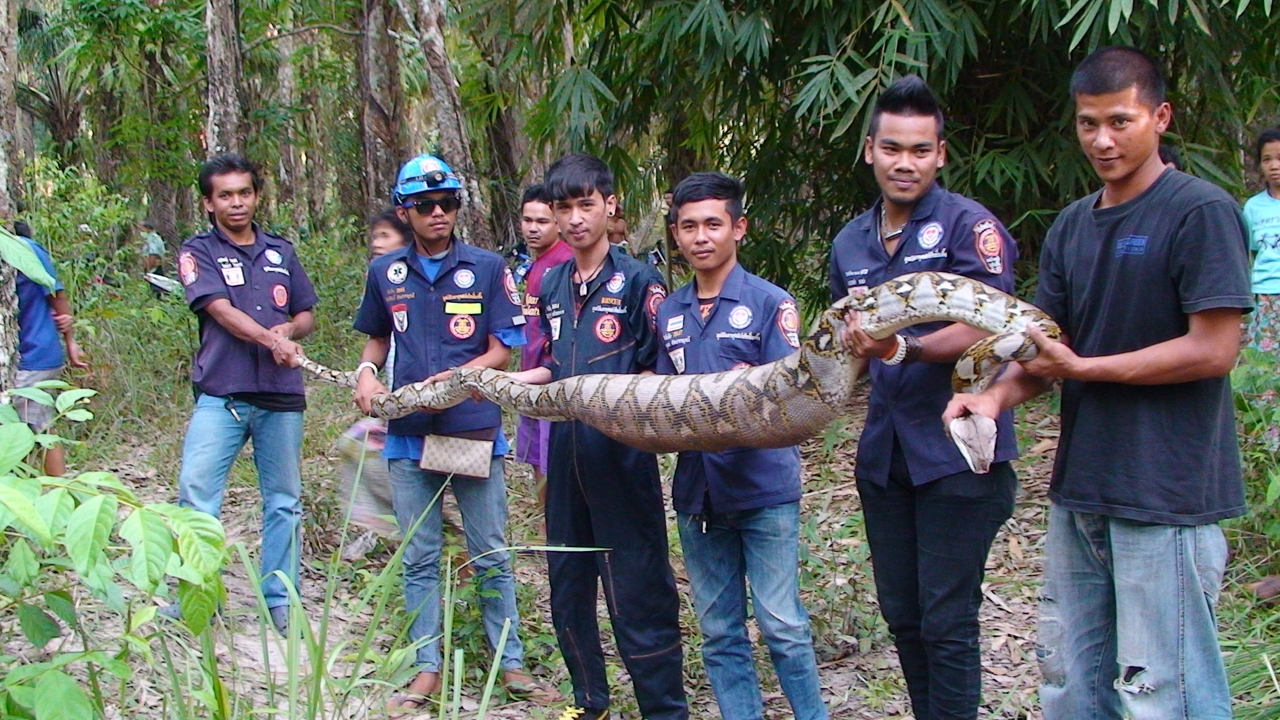 เมื่อเวลา 10.30 น. วันที่ 17 เม.ย.58 เจ้าหน้าที่กู้ภัยมูลนิธิใต้เต็กตึ๊งทุ่งใหญ่ จ.นครศรีธรรมราช ได้รับแจ้งจาก นายจักรวุฒิ บำรุงศรี อายุ 46 ปี ว่า พบงูเหลือมขนาดใหญ่กำลังกลืนสัตว์ไม่ทราบชนิดลงไปในท้อง ที่กลางสวนยางท้ายหมู่บ้านโคกส้มหม้าว หมู่ 12 ต.ท่ายาง อ.ทุ่งใหญ่ หลังรับแจ้งจึงนำกำลังอาสาสมัครจำนวนหนึ่ง พร้อมอุปกรณ์ไปตรวจสอบในจุดเกิดเหตุ