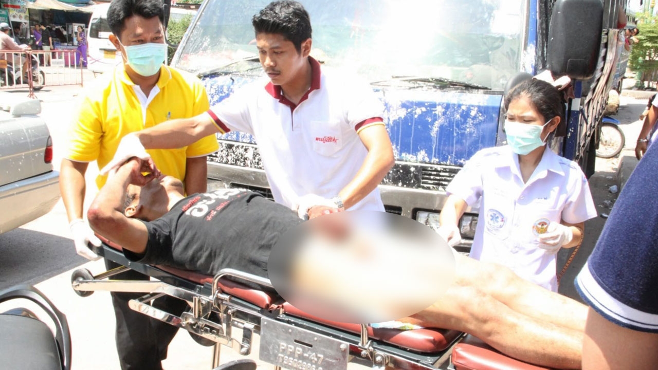 จากการสอบถามผู้เห็นเหตุการณ์ เล่าว่า ขณะขึ้นจากเรือข้ามฝากหน้าองค์พระสมุทรเจดีย์ ระหว่างเดินไปต่อรถโดยสารสองแถวสายพระสมุทรเจดีย์-ป้อมพระจุลฯ ได้ยินเสียงร้องขอความช่วยเหลือดังมาจากเพิงพักริมทาง จึงหันไปดูเห็นนายธงชัย ผู้บาดเจ็บนอนอยู่ในเพิงพัก ในลักษณะที่เป้ากางเกงมีเลือดไหลออกจำนวนมาก ตนจึงโทรศัพท์แจ้ง 1669 เพื่อขอความช่วยเหลือจากหน่วยกู้ชีพ