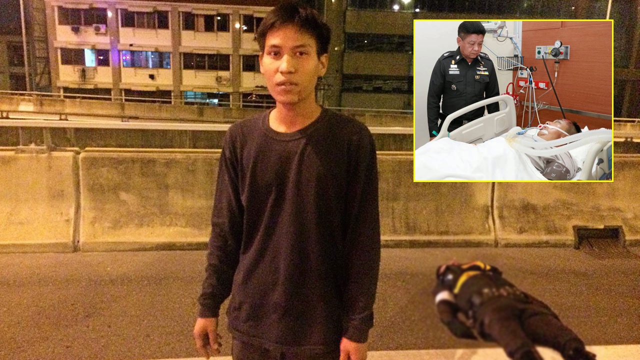 ส.ท.ตันติกร หมู่เย็น ทหารค่ายจักรพงษ์ ยืนรอ มอบตัว หลังขับรถเก๋งบีเอ็มดับเบิลยูขึ้นด่วนรามคำแหง แล้วพุ่งชน ด.ต.รณกร จันทร์วิเศษ จร.ทางด่วนเจ็บสาหัส (ภาพเล็ก) พล.ต.ท.ประวุฒิ ถาวรศิริ โฆษก ตร. รุดดูอาการ.