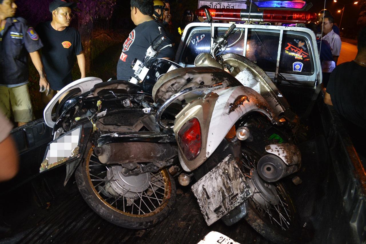 ในที่เกิดเหตุ บริเวณริมถนนขาเข้าเมือง พบรถ จยย. ยามาฮ่า ฟีโน่ สีขาวคาดน้ำตาล หมายเลขทะเบียน กม 334 จันทบุรี สภาพแต่งซิ่ง เสียหลักพุ่งตกลงไปอยู่ในร่องระบายน้ำ และพบศพหนุ่มวัยรุ่น อายุประมาณ 15-18 ปี สภาพร่างจมน้ำครำทั้งตัว ทางเจ้าหน้าที่กู้ภัยฯ ต้องช่วยกันลงไปนำศพขึ้นมาจากร่องน้ำอย่างทุลักทุเล จากการตรวจเบื้องต้น พบมีบาดแผลคอหัก กะโหลกช่วงเบ้าตาขวามีรอยยุบ ตรวจสอบพบมีทรัพย์สินเป็นเงินสดติดตัว 70 บาท บุหรี่ 1 ซอง แต่ไม่พบหลักฐานระบุว่าผู้ตายเป็นใคร