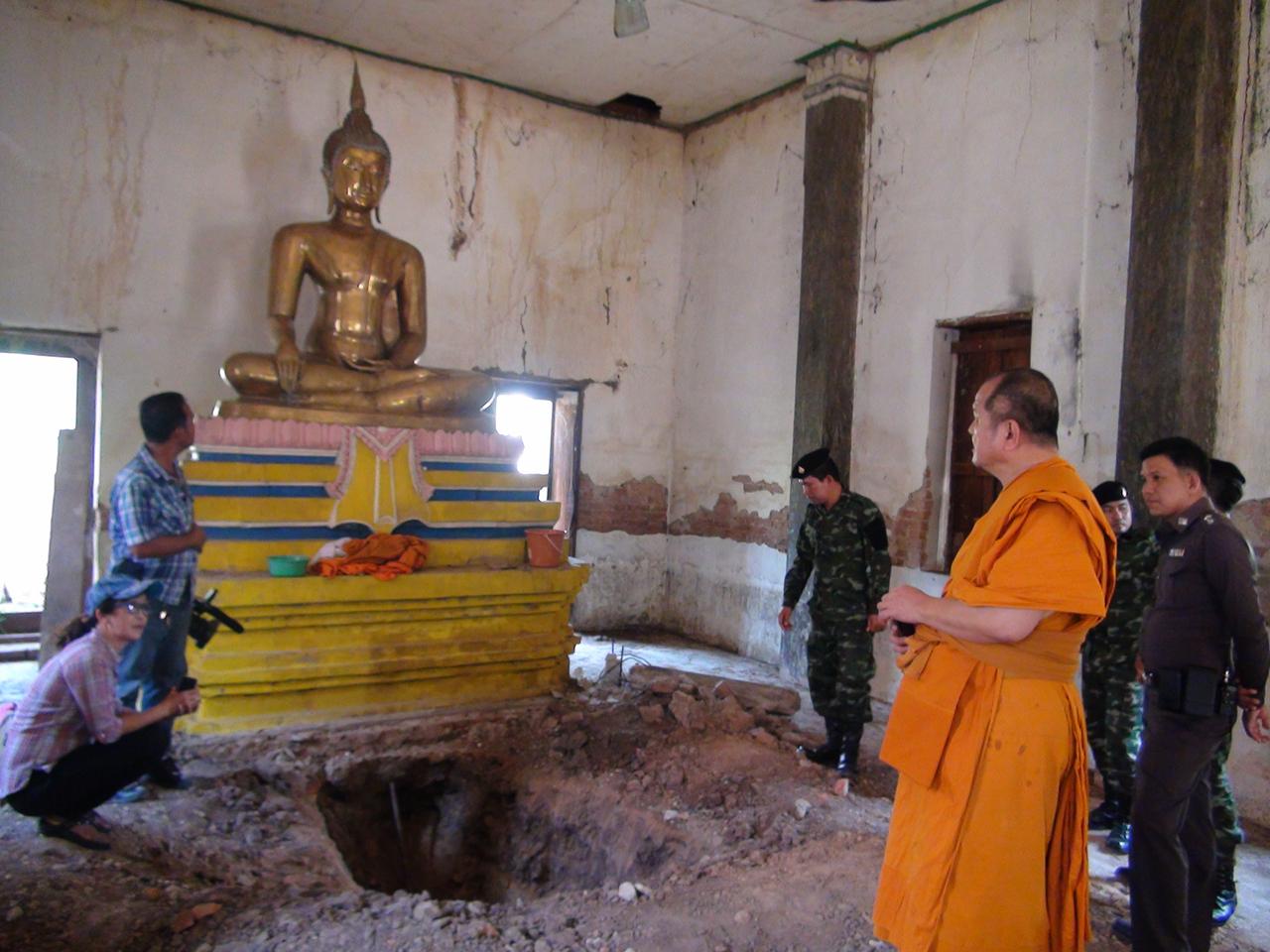 จากการตรวจสอบภายในโบสถ์เก่าของวัด พบว่าที่บริเวณฐานพระประธาน มีร่องรอยถูกขุดเป็นหลุม กว้างประมาณ 2 เมตร ลึกประมาณ 2 เมตร และมีรอยขุดเป็นโพรงเข้าไปใกล้ถึงใต้ฐานพระ มีจอบคาอยู่ที่ปากหลุม นอกจากนี้ บริเวณใบเสมามีการเคลื่อนย้ายออก เพื่อขุดหลุม รวมถึงที่หน้าโบสถ์ พบลูกนิมิตเนื้อหินทราย จำนวน 5 ลูกวางเรียงกันอยู่