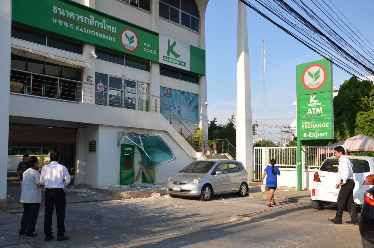 ที่เกิดเหตุพบพนักงานธนาคารกสิกรไทยและชาวบ้าน กำลังยืนวิพากษ์วิจารณ์กับเหตุการณ์ที่เพิ่งเกิดขึ้น โดยที่หน้าธนาคารพบรถเก๋งฮอนด้า แจ๊ซ สีบรอนซ์ หมายเลขทะเบียน ศต - 3954 กรุงเทพมหานคร หลังคาและข้างรถบุบ และรถเก๋งมาสด้า สีดำ หมายเลขทะเบียน 2 กง-4582 กรุงเทพมหานคร มีร่องรอยถูกสะเก็ดปูนจนประตูมีรอยบุบ นอกจากนี้ หลังคาโครงเหล็กของตู้เอทีเอ็ม ยังหักพังยับเยิน