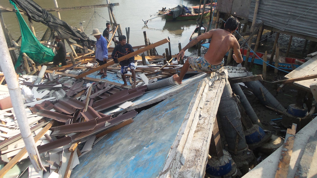 ส่วนบริเวณข้างเคียงซึ่งปลูกเป็นบ้านไม้ไว้ใช้สำหรับเก็บของ พังเสียหายอีกครึ่งหลัง ข้าวของ หลังคา ฝ้าเพดานแตกกระจายเกลื่อน เสาไฟฟ้าที่ปักอยู่ข้างบ้านเอนเอียงประมาณ 30 องศาฯ